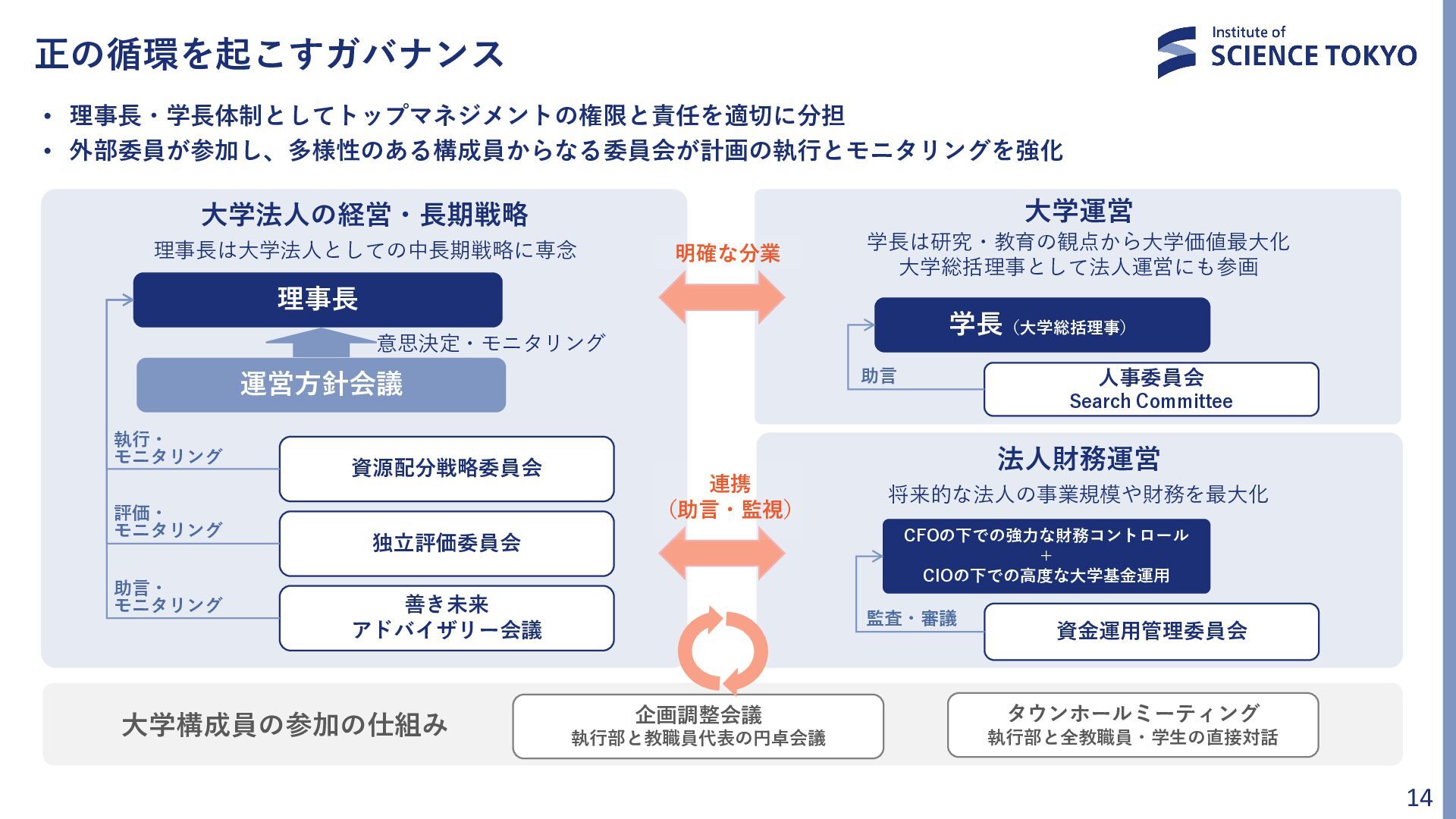 運営方針会議 資源配分戦略委員会 独立評価委員会 善き未来 アドバイザリー会議 意思決定・モニタリング 執行・ モニタリング 評価・ モニタリング 助言・ モニタリング 学長(大学総括理事) 人事委員会 Search Committee 助言 CFOの下での強力な財務コントロール + CIOの下での高度な大学基金運用 資金運用管理委員会 監査・審議 明確な分業 連携 (助言・監視) • 理事長・学長体制としてトップマネジメントの権限と責任を適切に分担 • 外部委員が参加し、多様性のある構成員からなる委員会が計画の執行とモニタリングを強化 企画調整会議 執行部と教職員代表の円卓会議 タウンホールミーティング 執行部と全教職員・学生の直接対話 大学構成員の参加の仕組み