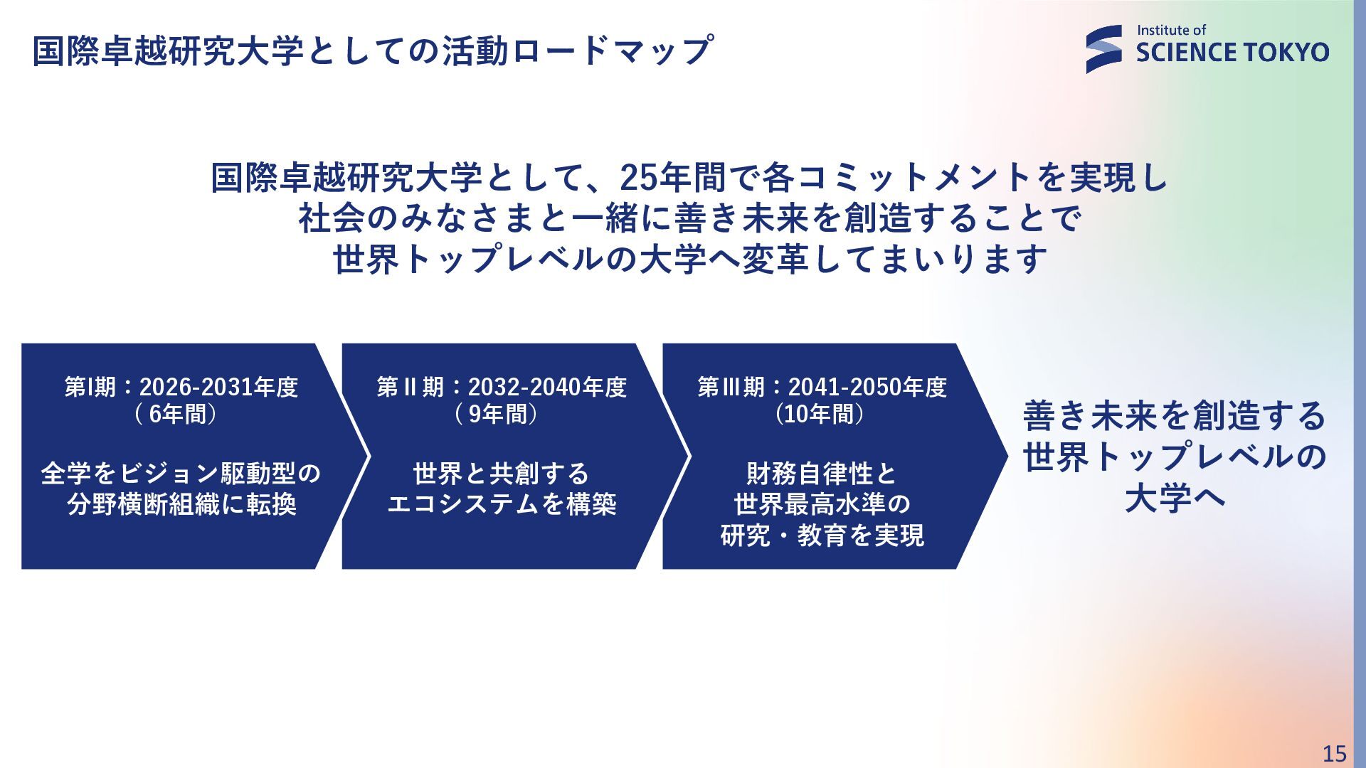 第Ⅱ期:2032-2040年度 ( 9年間) 世界と共創する エコシステムを構築 第I期:2026-2031年度 ( 6年間) 全学をビジョン駆動型の 分野横断組織に転換 国際卓越研究大学として、25年間で各コミットメントを実現し 社会のみなさまと一緒に善き未来を創造することで 世界トップレベルの大学へ変革してまいります