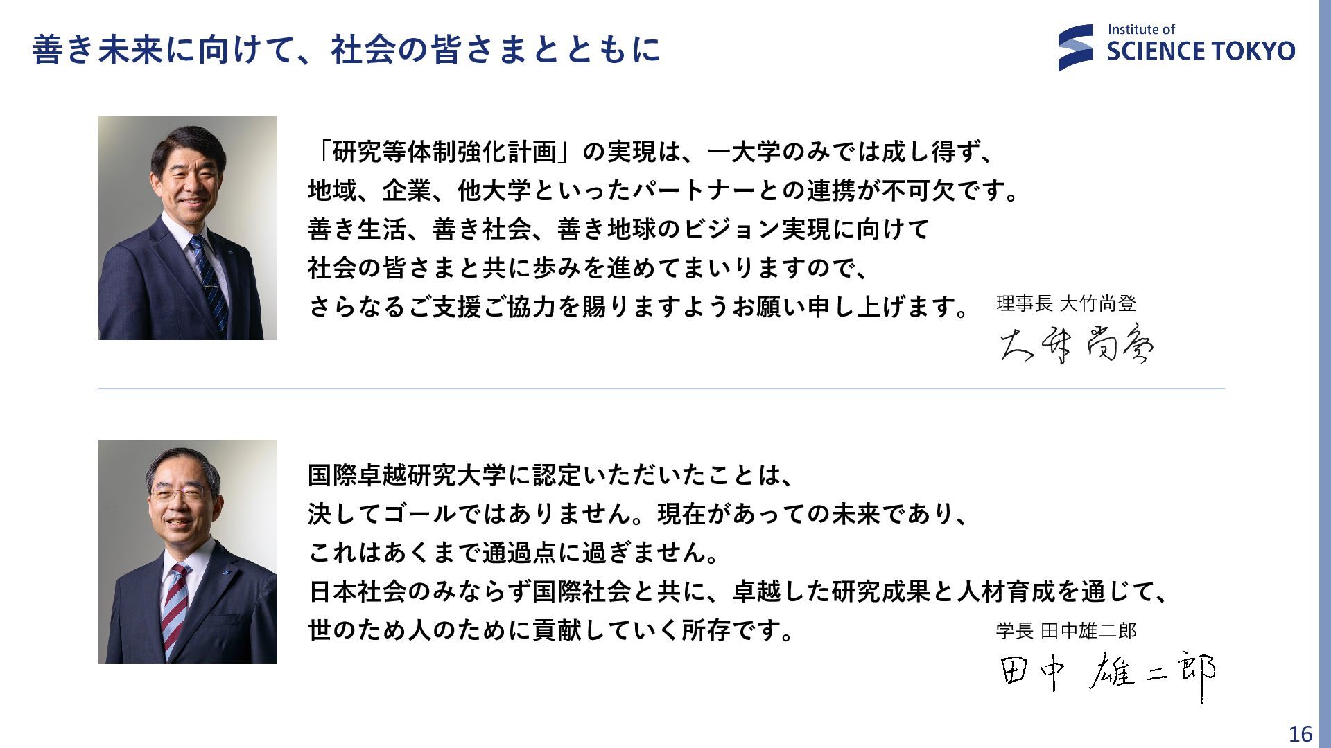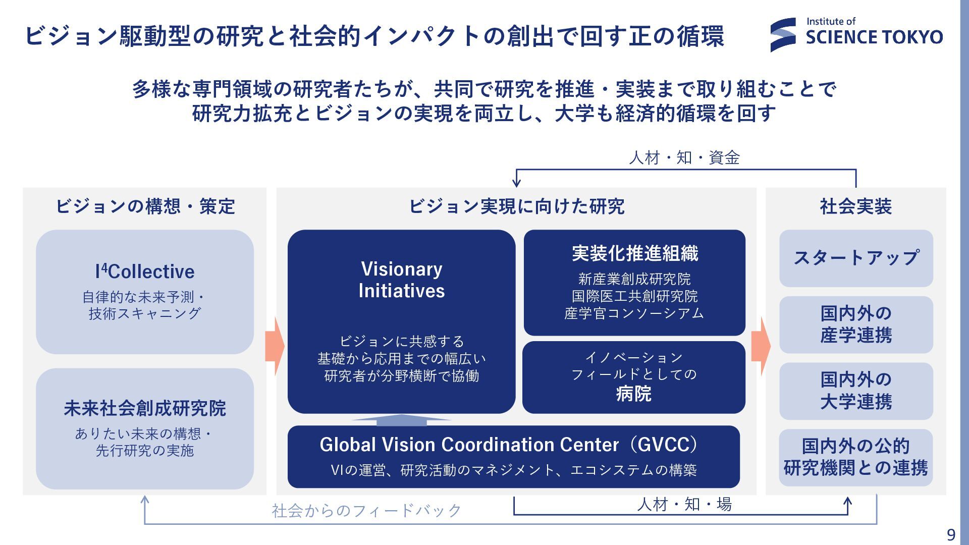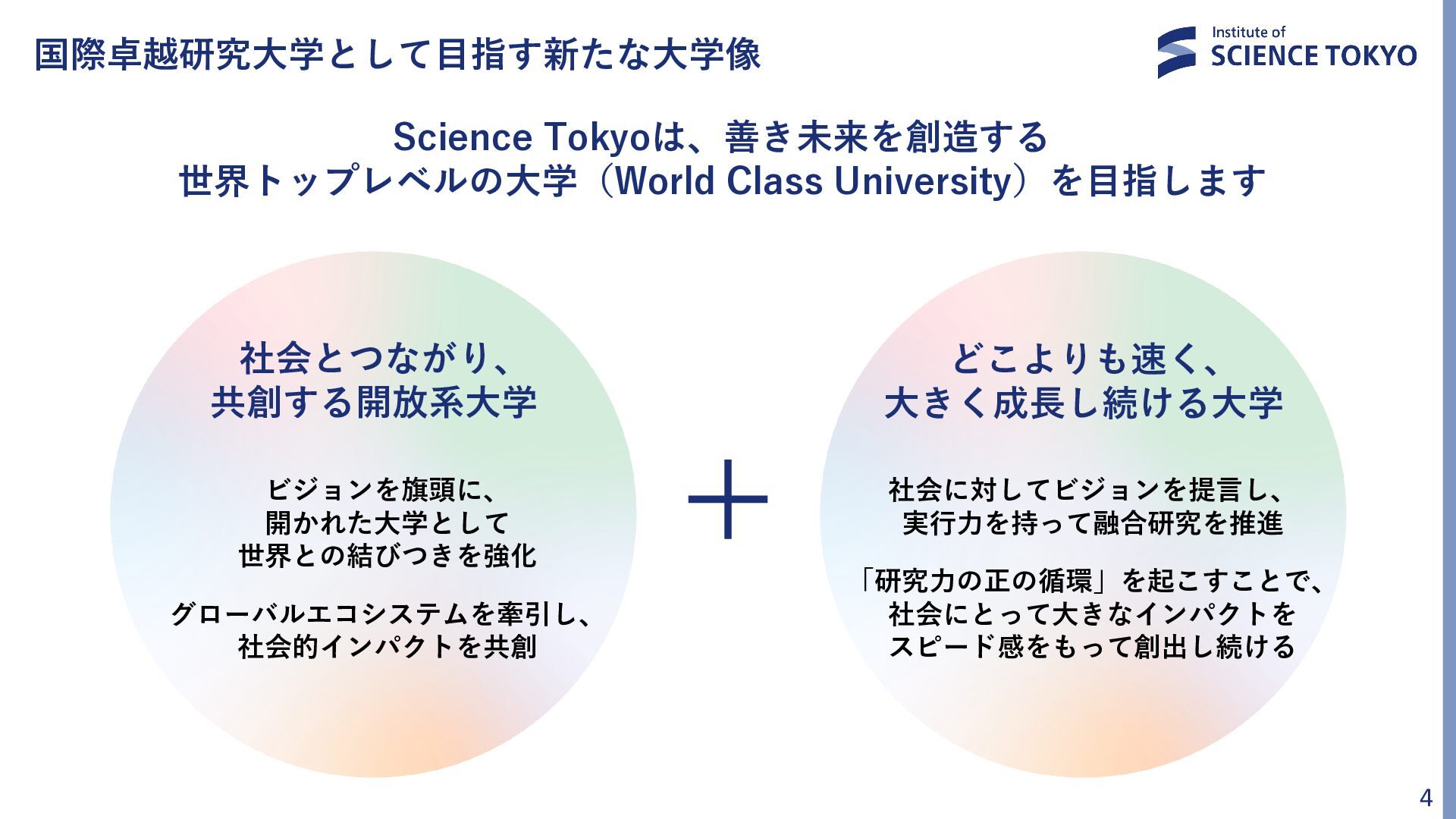 開かれた大学として 世界との結びつきを強化 グローバルエコシステムを牽引し、 社会的インパクトを共創 どこよりも速く、 大きく成長し続ける大学 社会に対してビジョンを提言し、 実行力を持って融合研究を推進 「研究力の正の循環」を起こすことで、 社会にとって大きなインパクトを スピード感をもって創出し続ける