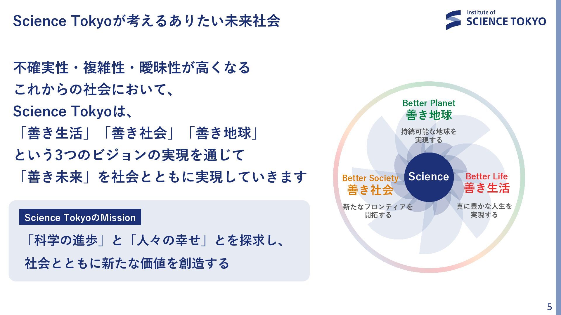Science TokyoのMission 「科学の進歩」と「⼈々の幸せ」とを探求し、 社会とともに新たな価値を創造する Better Society 善き社会 Better Planet 善き地球 Better Life 善き生活 持続可能な地球を 実現する 新たなフロンティアを 開拓する 真に豊かな人生を 実現する Science