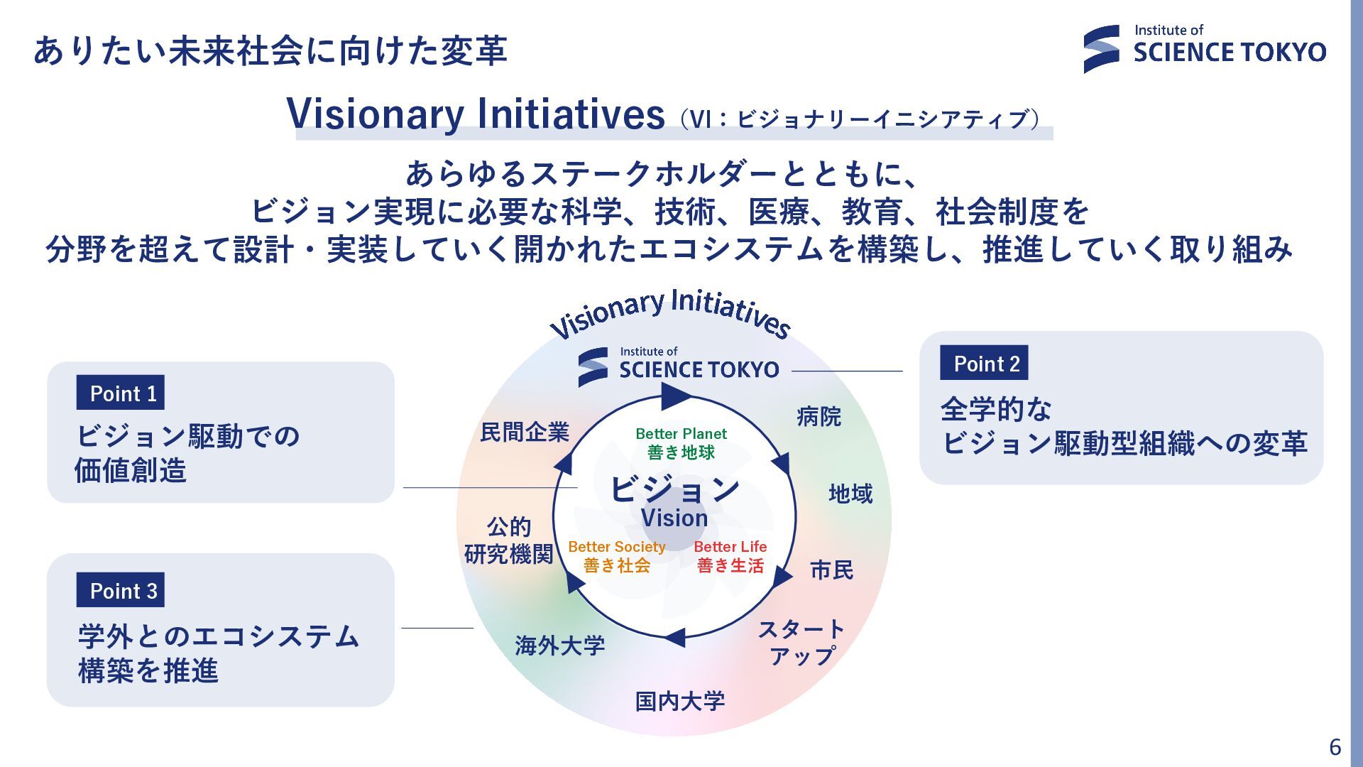 5. Science Tokyoが考えるありたい未来社会 不確実性・複雑性・曖昧性が高くなる これからの社会において、 Science Tokyoは、 「善き生活」「善き社会」「善き地球」 という3つのビジョンの実現を通じて 「善き未来」を社会とともに実現していきます 5