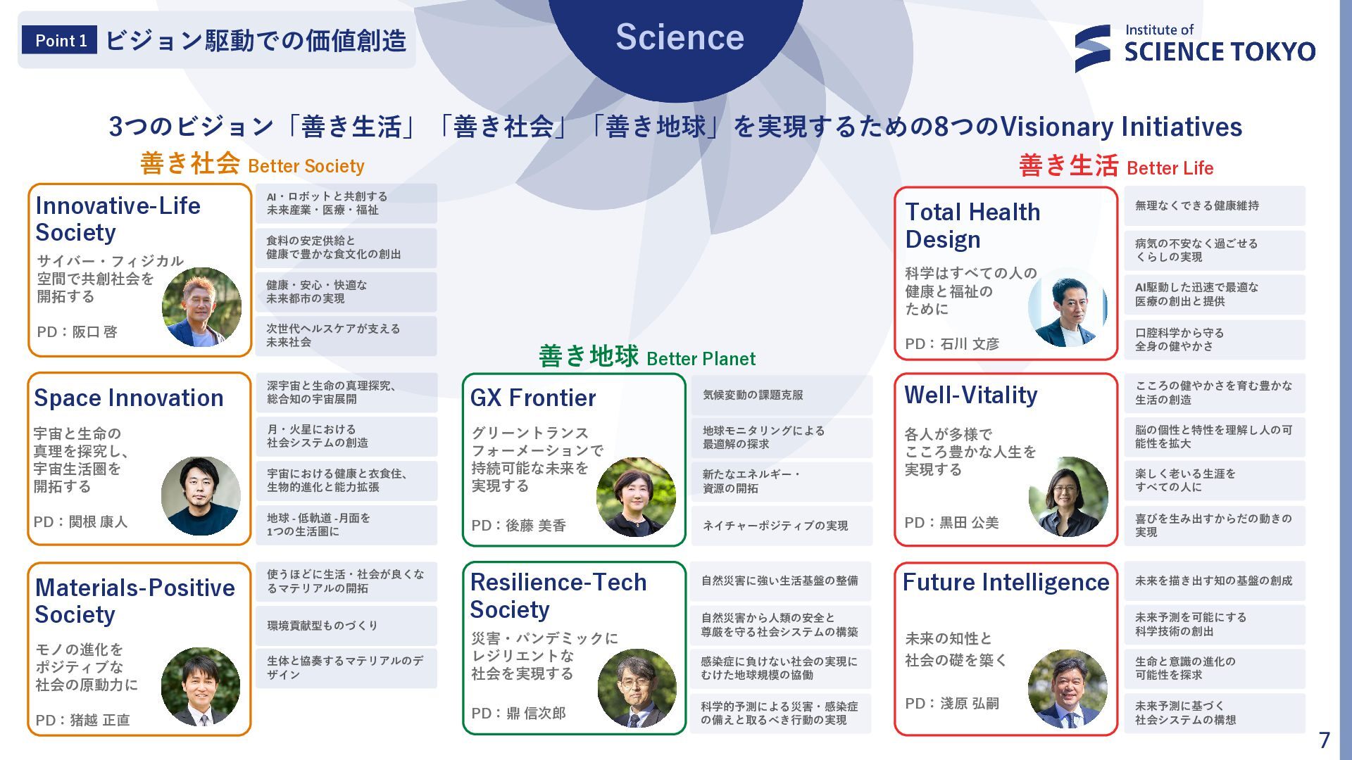 Better Life Resilience-Tech Society Total Health Design GX Frontier グリーントランス フォーメーションで 持続可能な未来を 実現する PD:後藤 美香 科学はすべての人の 健康と福祉の ために PD:石川 文彦 未来の知性と 社会の礎を築く PD:淺原 弘嗣 Well-Vitality 各人が多様で こころ豊かな人生を 実現する PD:黒田 公美 災害・パンデミックに レジリエントな 社会を実現する PD:鼎 信次郎 Science Materials-Positive Society モノの進化を ポジティブな 社会の原動⼒に PD:猪越 正直 Space Innovation 宇宙と生命の 真理を探究し、 宇宙生活圏を 開拓する PD:関根 康人 Innovative-Life Society サイバー・フィジカル 空間で共創社会を 開拓する PD:阪口 啓 使うほどに生活・社会が良くな るマテリアルの開拓 環境貢献型ものづくり 生体と協奏するマテリアルのデ ザイン 深宇宙と生命の真理探究、 総合知の宇宙展開 月・火星における 社会システムの創造 宇宙における健康と衣食住、 生物的進化と能力拡張 地球 - 低軌道 -月面を 1つの生活圏に AI・ロボットと共創する 未来産業・医療・福祉 食料の安定供給と 健康で豊かな食文化の創出 健康・安心・快適な 未来都市の実現 次世代ヘルスケアが支える 未来社会 気候変動の課題克服 地球モニタリングによる 最適解の探求 新たなエネルギー・ 資源の開拓 ネイチャーポジティブの実現 自然災害に強い生活基盤の整備 自然災害から人類の安全と 尊厳を守る社会システムの構築 感染症に負けない社会の実現に むけた地球規模の協働 科学的予測による災害・感染症 の備えと取るべき行動の実現 無理なくできる健康維持 病気の不安なく過ごせる くらしの実現 AI駆動した迅速で最適な 医療の創出と提供 口腔科学から守る 全身の健やかさ 未来を描き出す知の基盤の創成 未来予測を可能にする 科学技術の創出 生命と意識の進化の 可能性を探求 未来予測に基づく 社会システムの構想 こころの健やかさを育む豊かな 生活の創造 脳の個性と特性を理解し人の可 能性を拡大 楽しく老いる生涯を すべての人に 喜びを生み出すからだの動きの 実現 ビジョン駆動での価値創造 Point 1 3つのビジョン「善き生活」「善き社会」「善き地球」を実現するための8つのVisionary Initiatives