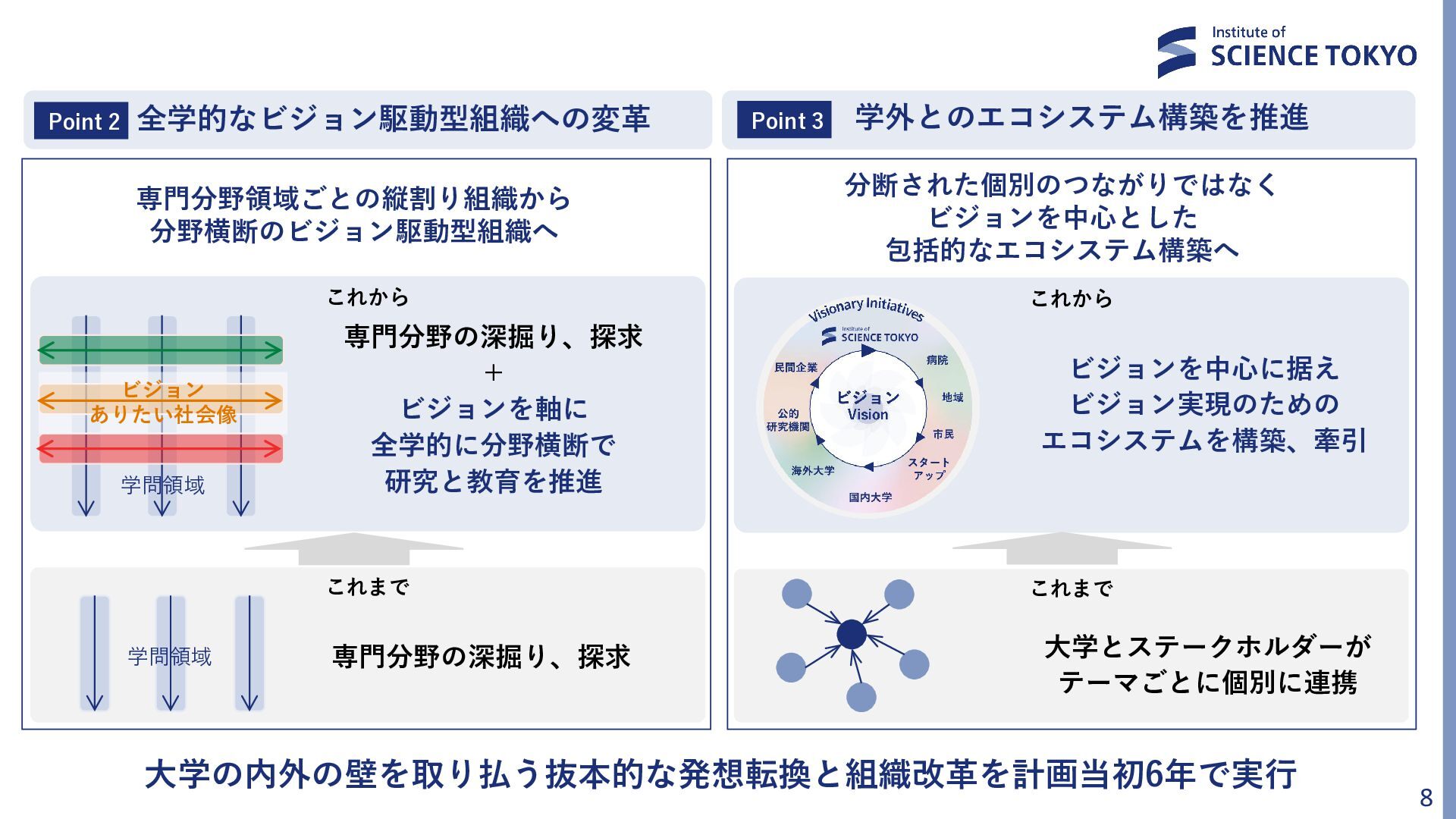 7. これまで これから これまで 専門分野の深掘り、探求 大学とステークホルダーが テーマごとに個別に連携 これから 専門分野の深掘り、探求 + ビジョンを軸に