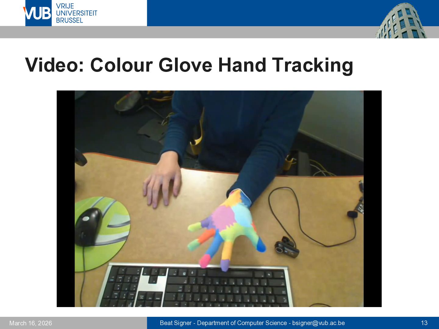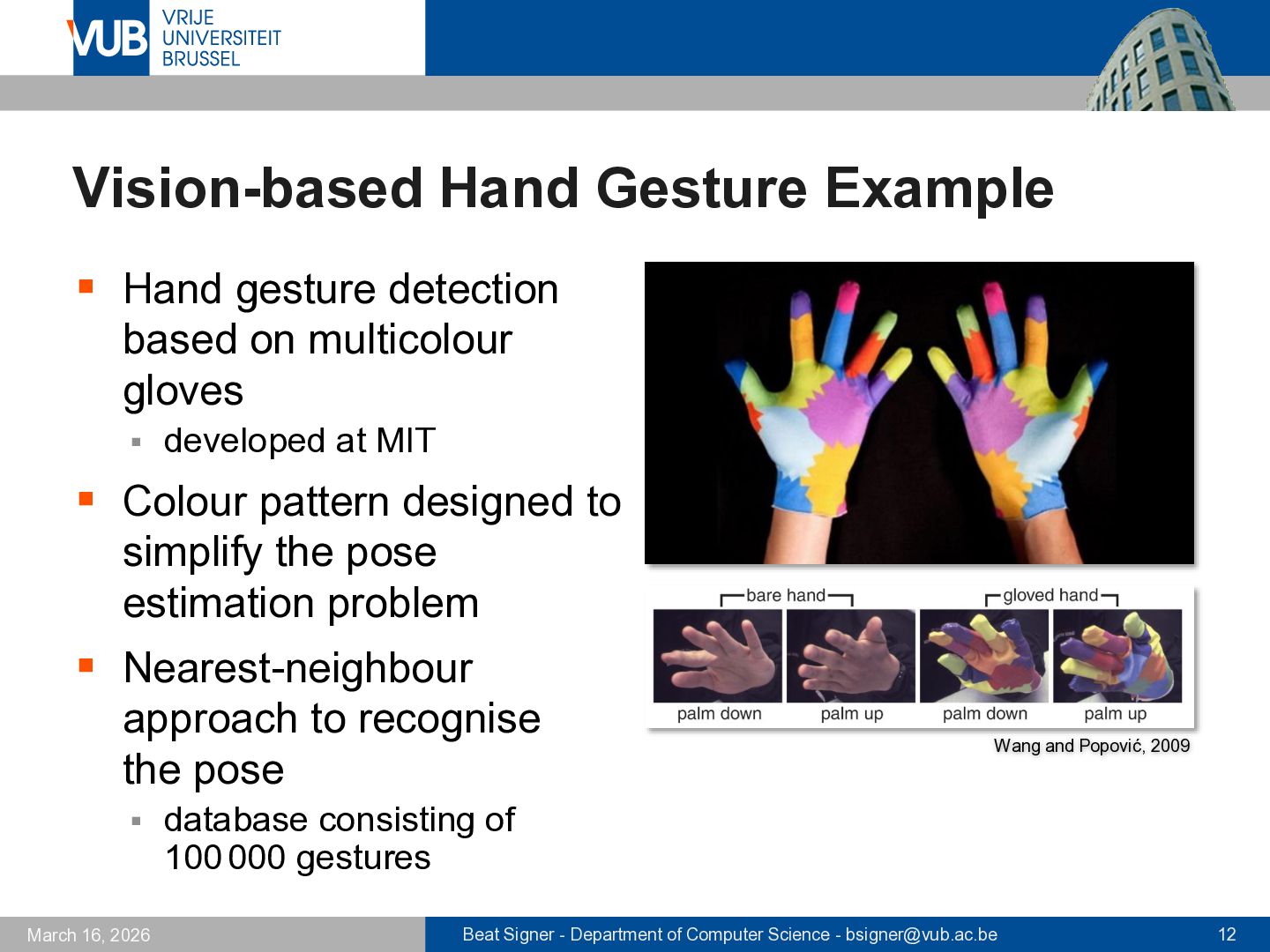 March 16, 2026 Vision-based Hand Gesture Example ▪ Hand gesture detection based on multicolour gloves ▪ developed at MIT ▪ Colour pattern designed to simplify the pose estimation problem ▪ Nearest-neighbour approach to recognise the pose ▪ database consisting of 100000 gestures Wang and Popović, 2009