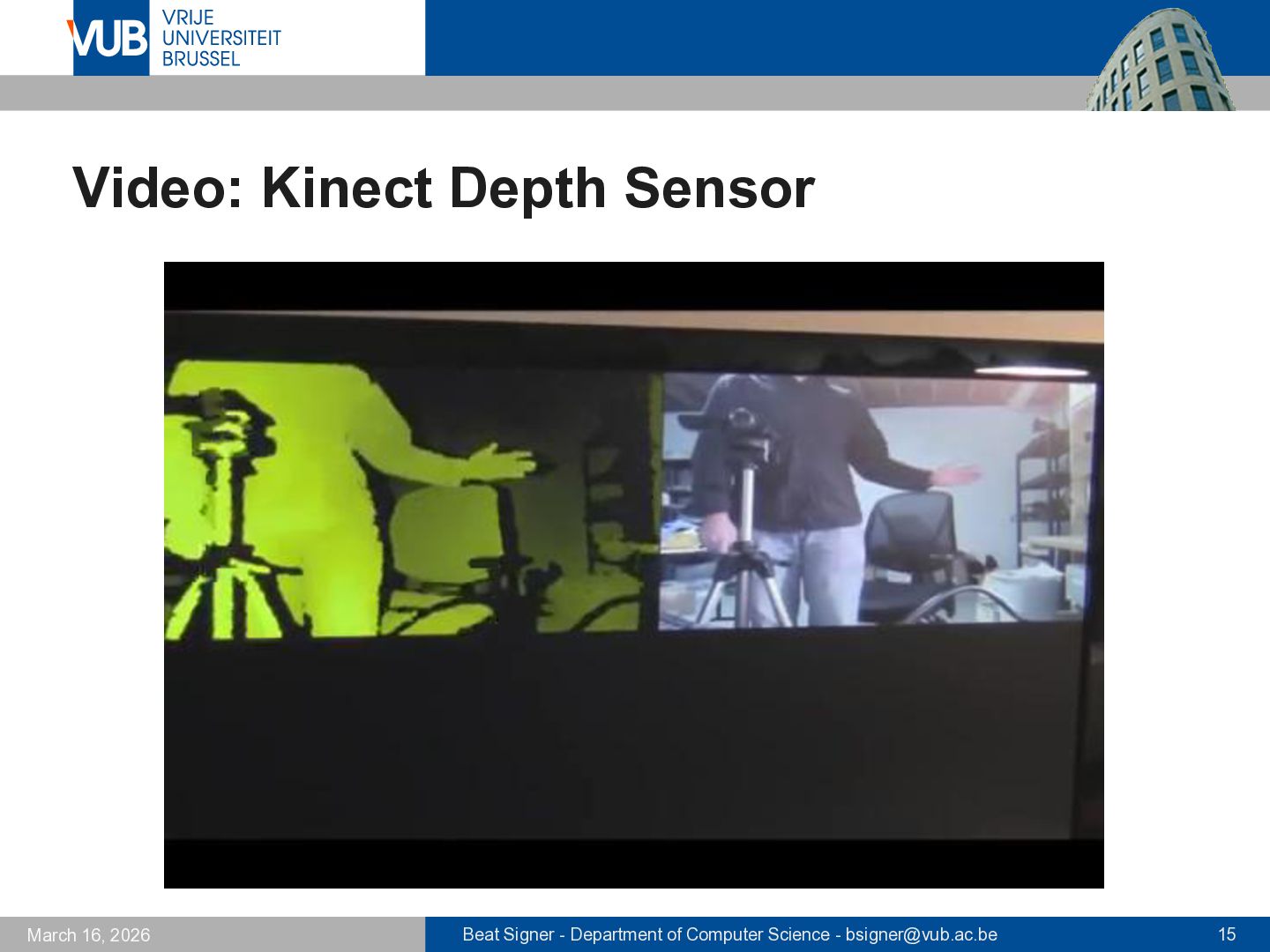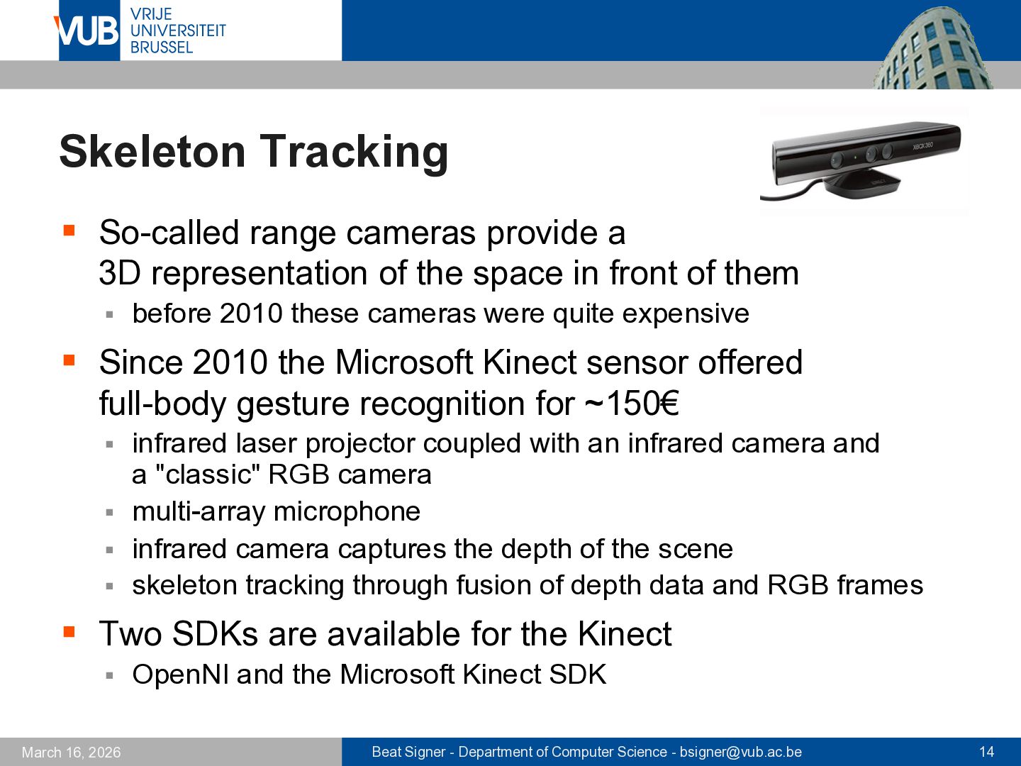 March 16, 2026 Skeleton Tracking ▪ So-called range cameras provide a 3D representation of the space in front of them ▪ before 2010 these cameras were quite expensive ▪ Since 2010 the Microsoft Kinect sensor offered full-body gesture recognition for ~150€ ▪ infrared laser projector coupled with an infrared camera and a "classic" RGB camera ▪ multi-array microphone ▪ infrared camera captures the depth of the scene ▪ skeleton tracking through fusion of depth data and RGB frames ▪ Two SDKs are available for the Kinect ▪ OpenNI and the Microsoft Kinect SDK