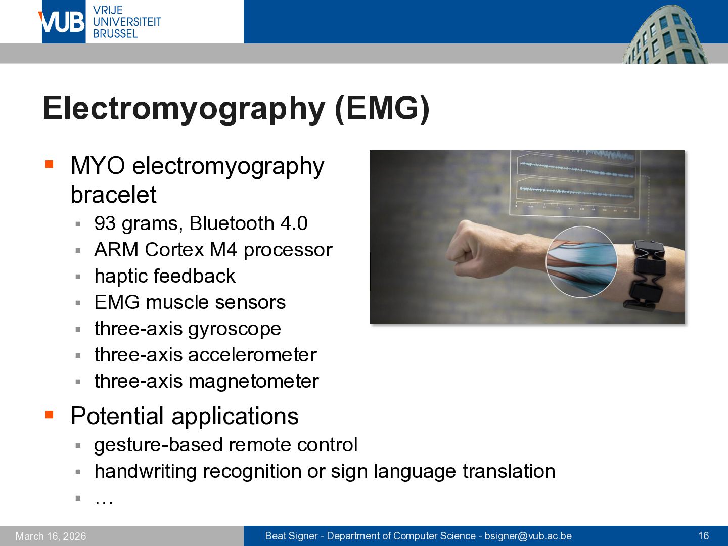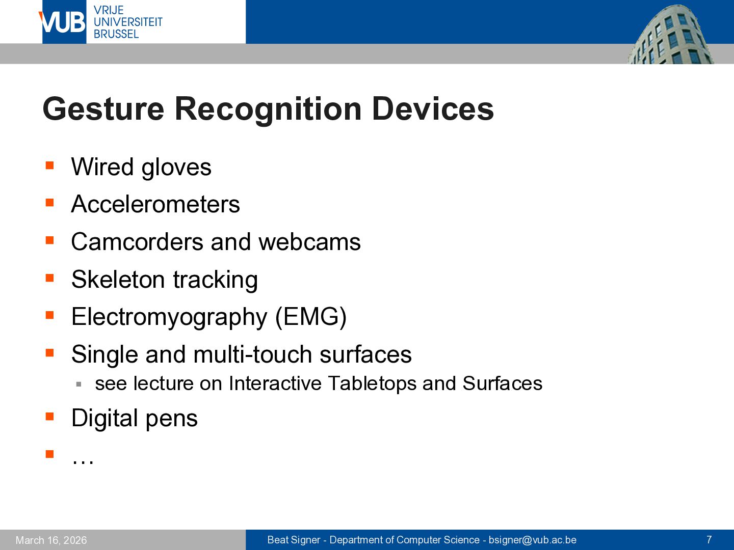 March 16, 2026 Gesture Recognition Devices ▪ Wired gloves ▪ Accelerometers ▪ Camcorders and webcams ▪ Skeleton tracking ▪ Electromyography (EMG) ▪ Single and multi-touch surfaces ▪ see lecture on Interactive Tabletops and Surfaces ▪ Digital pens ▪ …