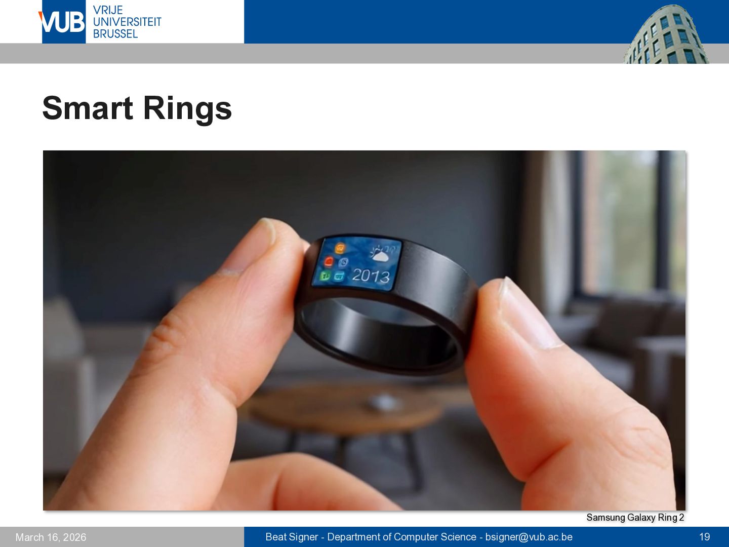 March 16, 2026 Accelerometers … ▪ gaming devices (e.g.Nintendo Wii Remote) - note that the pointing with a Wii Remote is not recognised through the accelerometer but via an infrared camera in the head of the Wii Remote ▪ Accelerometers can be used to recognise dynamic gestures but not for the recognition of postures ▪ record the 3-dimensional input data, pre-process and vectorise it ▪ apply pattern recognition techniques on the vectorised data ▪ Typical recognition techniques ▪ dynamic time warping (DTW) ▪ neural networks ▪ Hidden Markov Models (HMM) ▪ All these techniques require some training data
