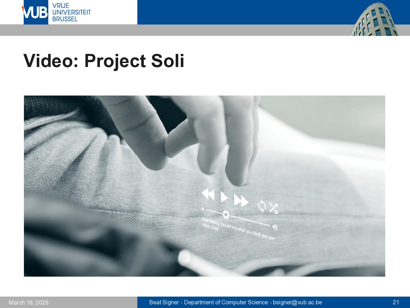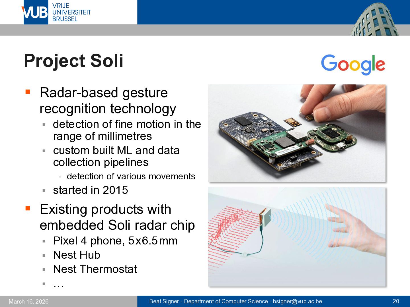 March 16, 2026 Project Soli ▪ Radar-based gesture recognition technology ▪ detection of fine motion in the range of millimetres ▪ custom built ML and data collection pipelines - detection of various movements ▪ started in 2015 ▪ Existing products with embedded Soli radar chip ▪ Pixel 4 phone, 5x6.5mm ▪ Nest Hub ▪ Nest Thermostat ▪ …