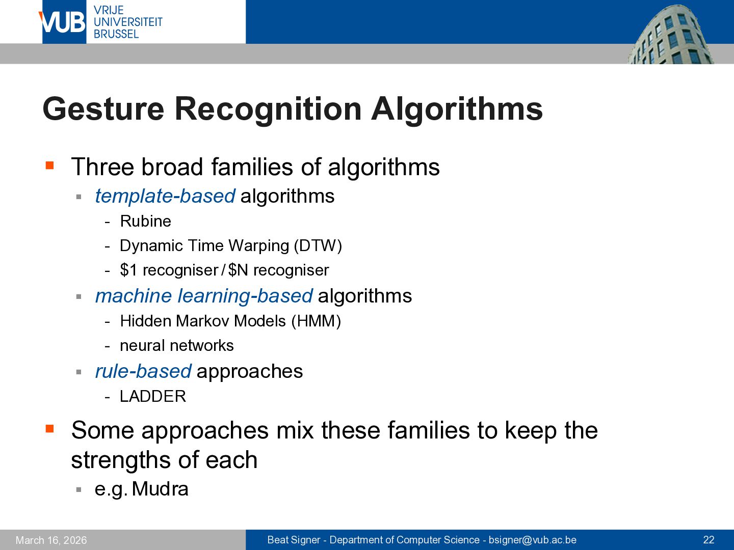 March 16, 2026 Gesture Spotting/Segmentation ▪ Always-on mid-air interfaces like the Microsoft Kinect do not offer an explicit start and end point of a gesture ▪ How do we know when a gesture starts? ▪ use another modality (e.g.pressing a button or voice command) - not a very natural interaction ▪ try to continuously spot potential gestures ▪ We introduced a new gesture spotting approach based on a human-readable representation of automatically inferred spatio-temporal constraints ▪ potential gestures handed over to a gesture recogniser Hoste et al., 2013