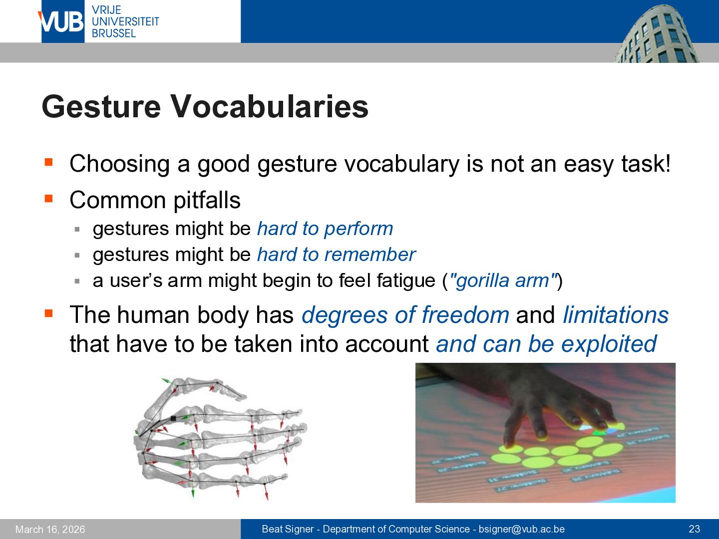 March 16, 2026 Gesture Vocabularies ▪ Choosing a good gesture vocabulary is not an easy task! ▪ Common pitfalls ▪ gestures might be hard to perform ▪ gestures might be hard to remember ▪ a user’s arm might begin to feel fatigue ("gorilla arm") ▪ The human body has degrees of freedom and limitations that have to be taken into account and can be exploited