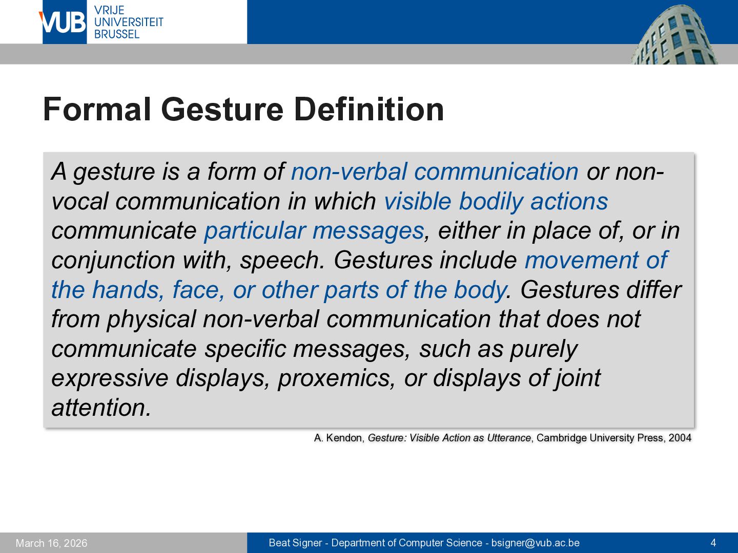March 16, 2026 Formal Gesture Definition A gesture is a form of non-verbal communication or non- vocal communication in which visible bodily actions communicate particular messages, either in place of, or in conjunction with, speech. Gestures include movement of the hands, face, or other parts of the body. Gestures differ from physical non-verbal communication that does not communicate specific messages, such as purely expressive displays, proxemics, or displays of joint attention. A. Kendon, Gesture: Visible Action as Utterance, Cambridge University Press, 2004