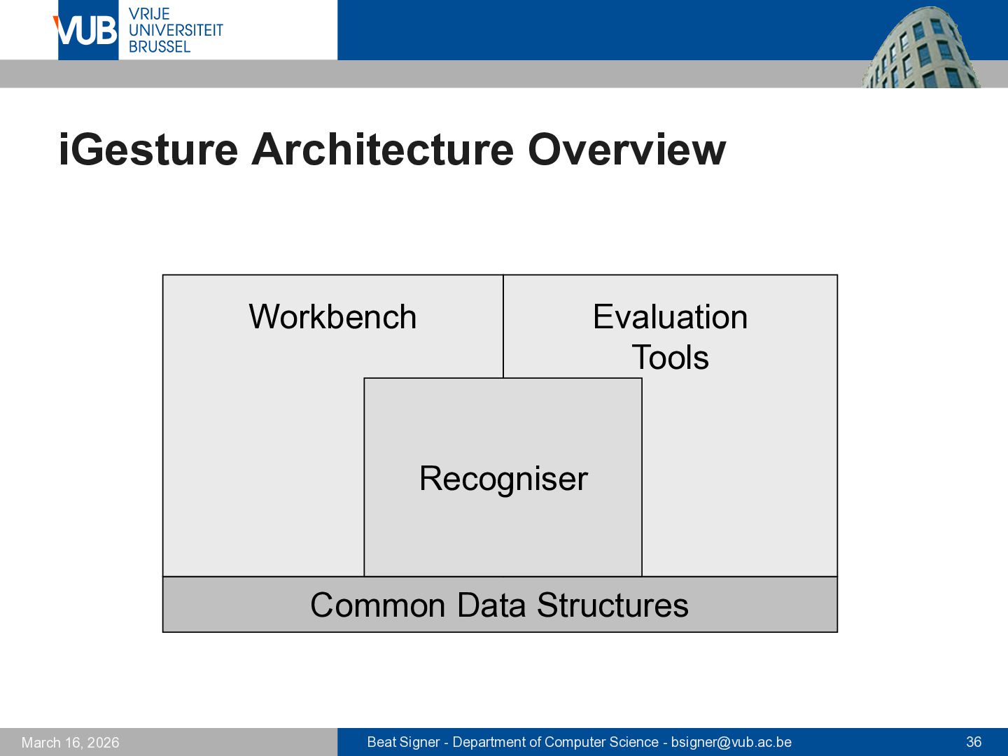 March 16, 2026 iGesture Architecture Overview Common Data Structures Common Data Structures Workbench Workbench Evaluation Tools Evaluation Tools Recogniser