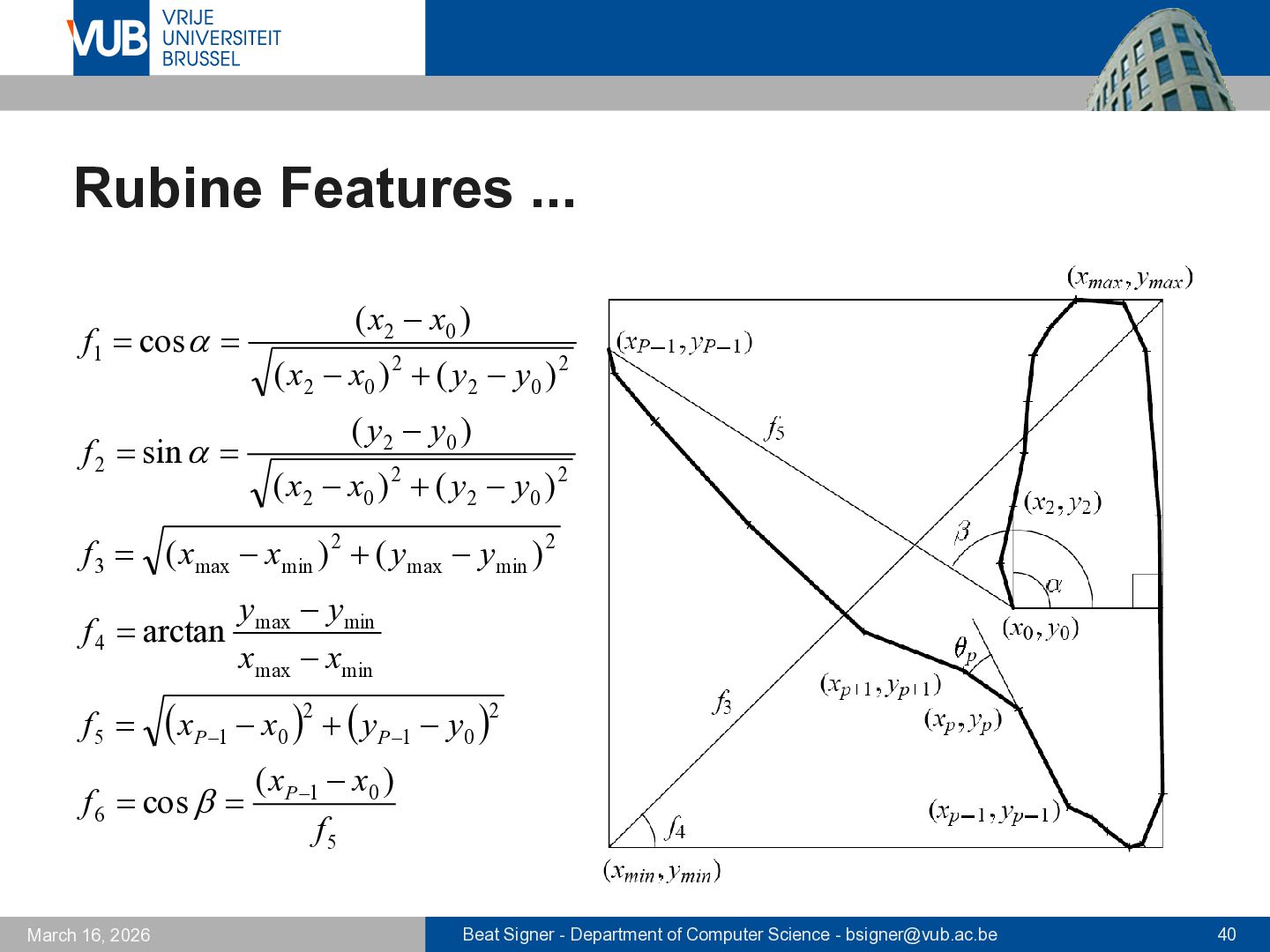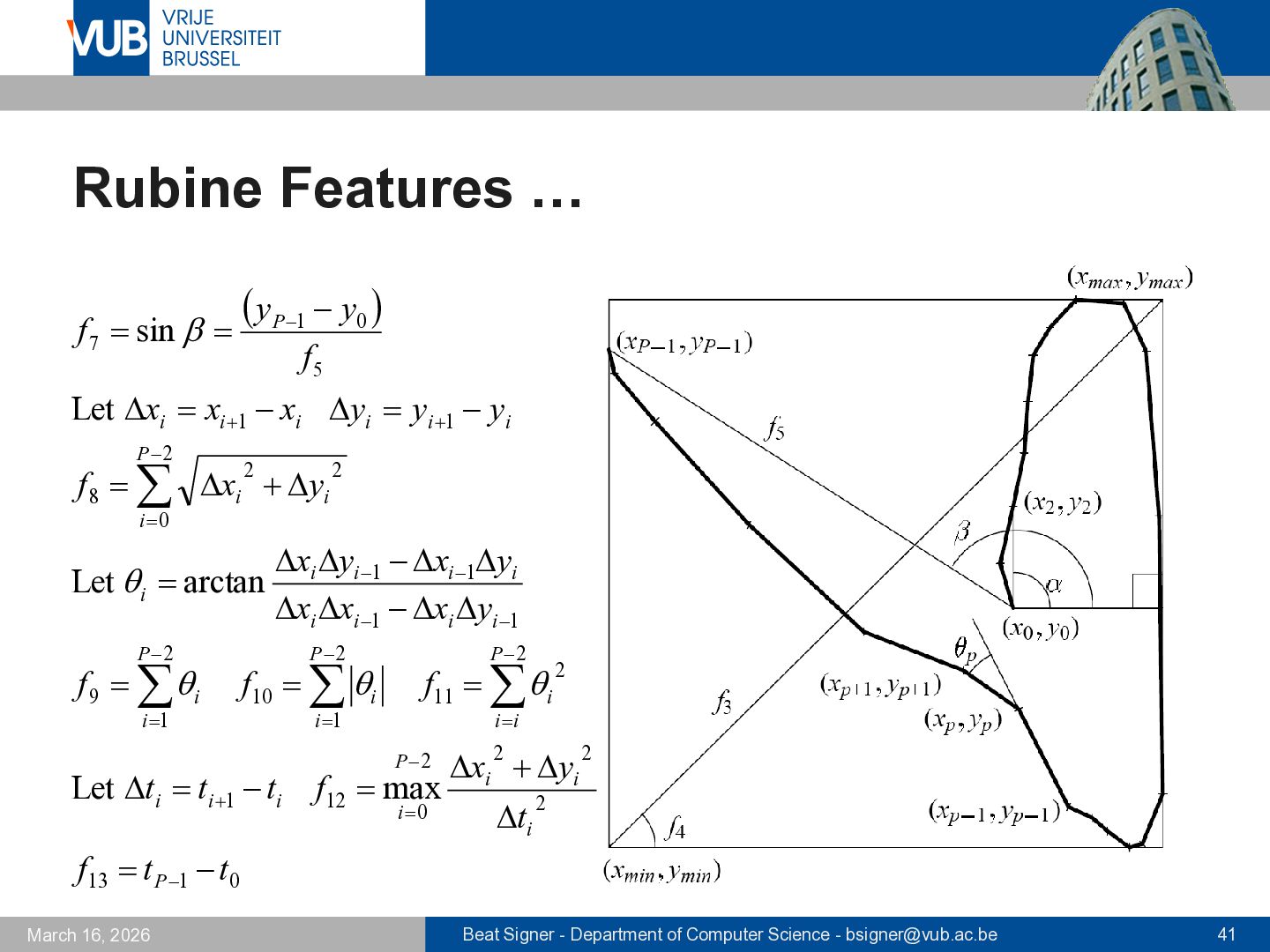 March 16, 2026 Rubine Features ... ( ) ( ) 5 0 1 6 2 0 1 2 0 1 5 min max min max 4 2 min max 2 min max 3 2 0 2 2 0 2 0 2 2 2 0 2 2 0 2 0 2 1 ) ( cos arctan ) ( ) ( ) ( ) ( ) ( sin ) ( ) ( ) ( cos f x x f y y x x f x x y y f y y x x f y y x x y y f y y x x x x f P P P − = = − + − = − − = − + − = − + − − = = − + − − = = − − −