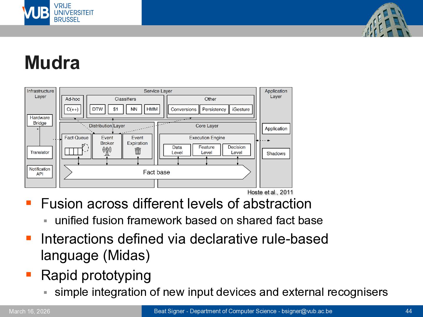 March 16, 2026 Mudra ▪ Fusion across different levels of abstraction ▪ unified fusion framework based on shared fact base ▪ Interactions defined via declarative rule-based language (Midas) ▪ Rapid prototyping ▪ simple integration of new input devices and external recognisers Hoste et al., 2011