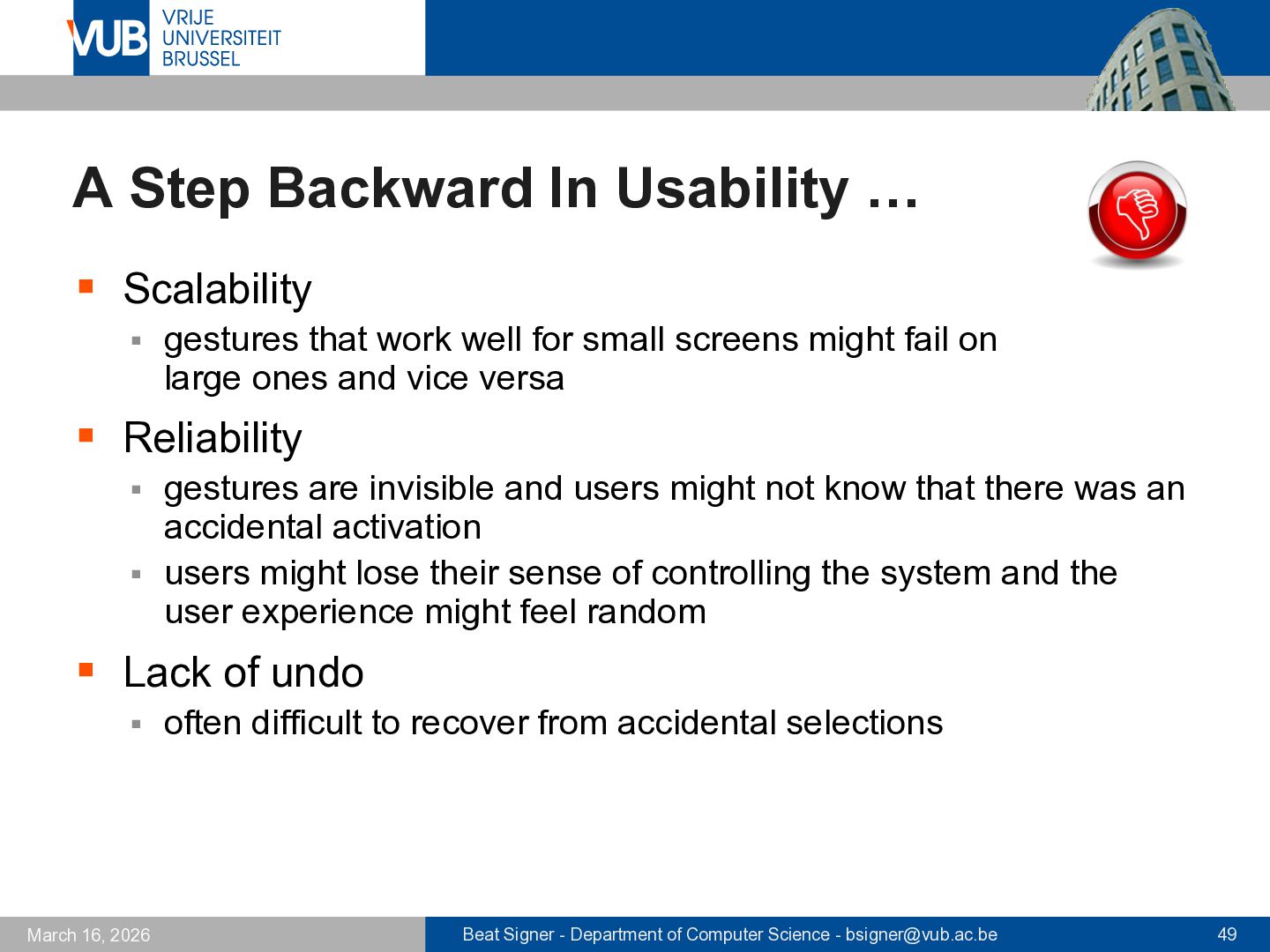 March 16, 2026 A Step Backward In Usability … ▪ Scalability ▪ gestures that work well for small screens might fail on large ones and vice versa ▪ Reliability ▪ gestures are invisible and users might not know that there was an accidental activation ▪ users might lose their sense of controlling the system and the user experience might feel random ▪ Lack of undo ▪ often difficult to recover from accidental selections