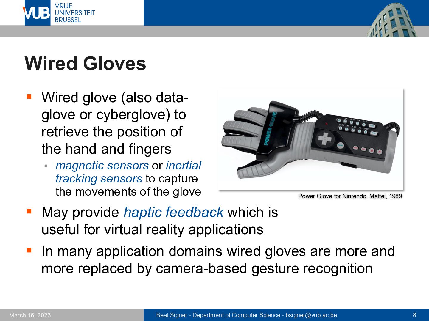 March 16, 2026 Wired Gloves ▪ Wired glove (also data- glove or cyberglove) to retrieve the position of the hand and fingers ▪ magnetic sensors or inertial tracking sensors to capture the movements of the glove ▪ May provide haptic feedback which is useful for virtual reality applications ▪ In many application domains wired gloves are more and more replaced by camera-based gesture recognition Power Glove for Nintendo, Mattel, 1989