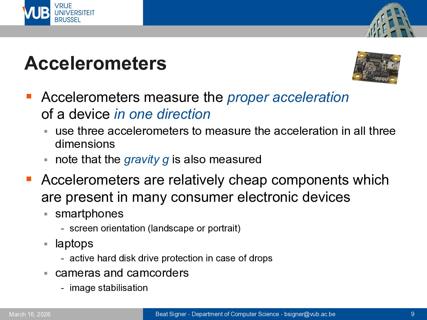 March 16, 2026 Accelerometers ▪ Accelerometers measure the proper acceleration of a device in one direction ▪ use three accelerometers to measure the acceleration in all three dimensions ▪ note that the gravity g is also measured ▪ Accelerometers are relatively cheap components which are present in many consumer electronic devices ▪ smartphones - screen orientation (landscape or portrait) ▪ laptops - active hard disk drive protection in case of drops ▪ cameras and camcorders - image stabilisation