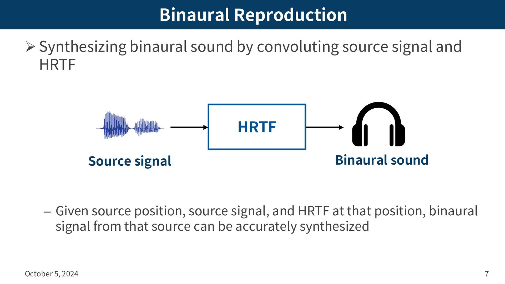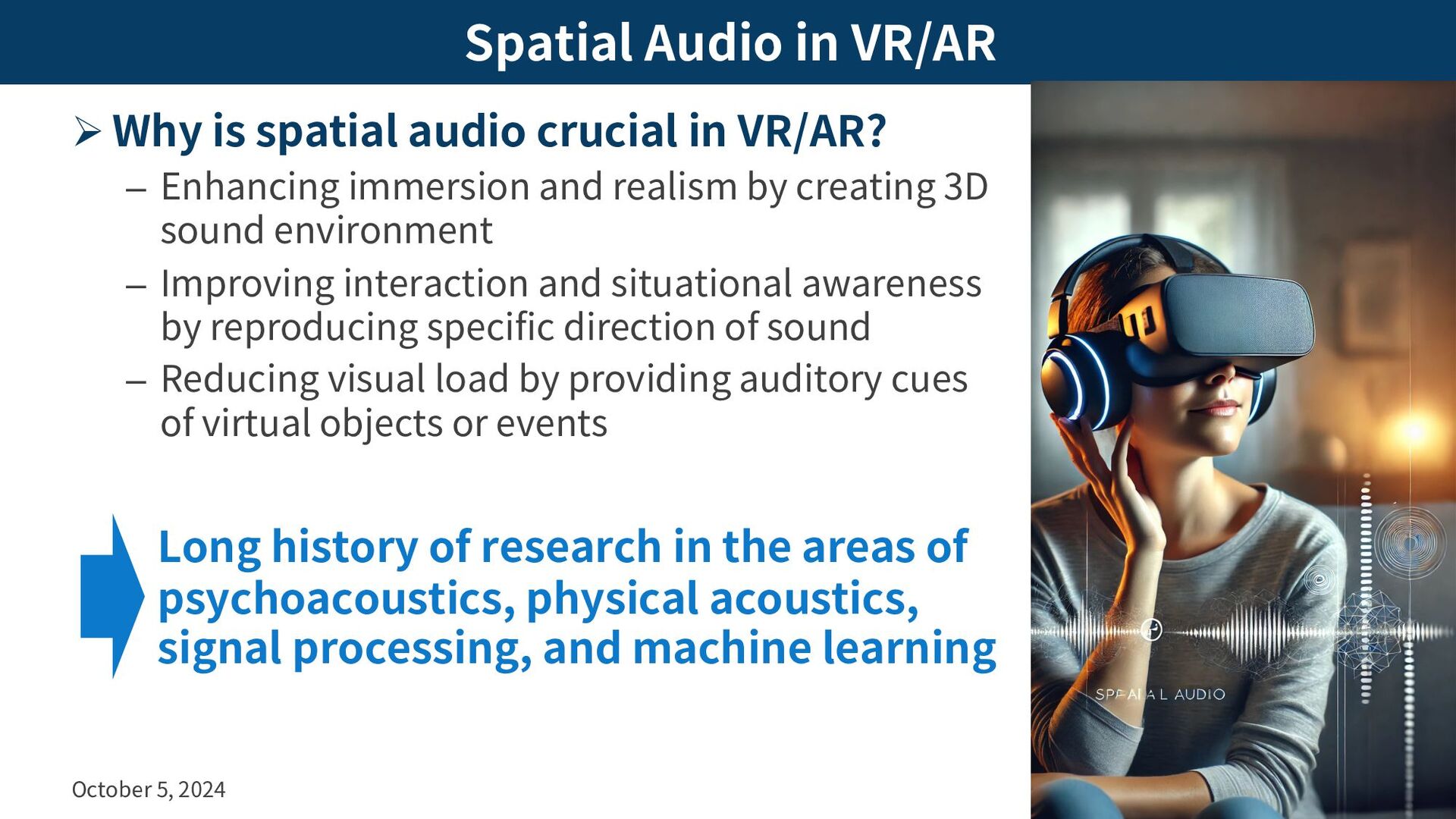 in VR/AR? – Enhancing immersion and realism by creating 3D sound environment – Improving interaction and situational awareness by reproducing specific direction of sound – Reducing visual load by providing auditory cues of virtual objects or events October 5, 2024 2 Long history of research in the areas of psychoacoustics, physical acoustics, signal processing, and machine learning