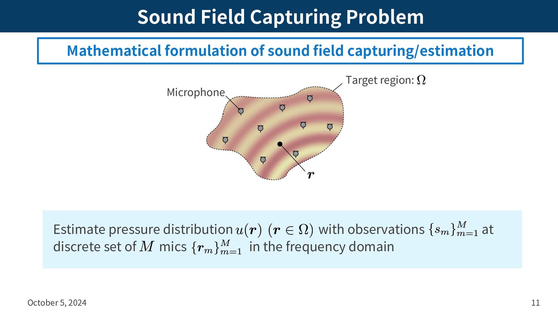 of sound field capturing/estimation Estimate pressure distribution with observations at discrete set of mics in the frequency domain Microphone Target region: