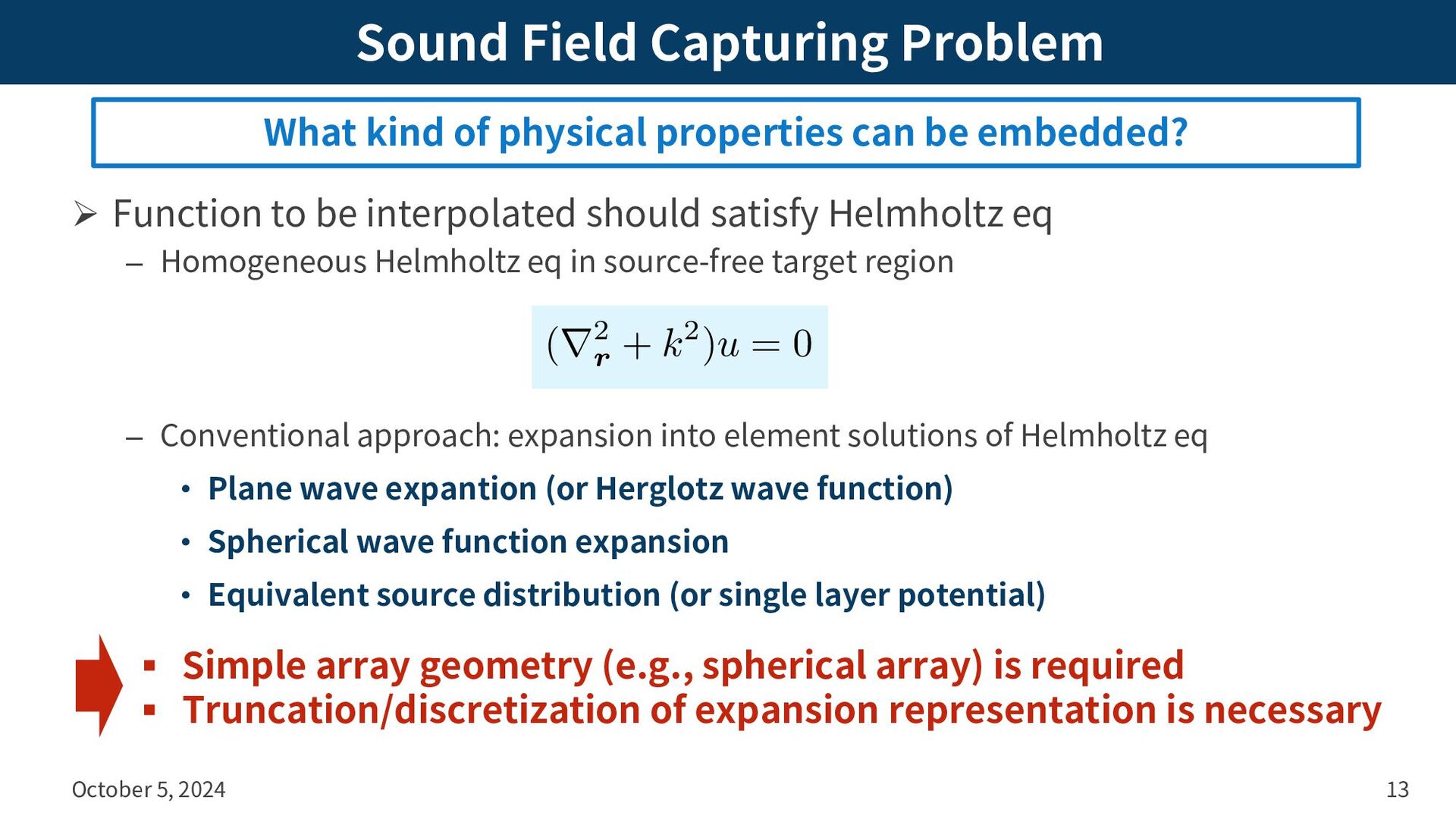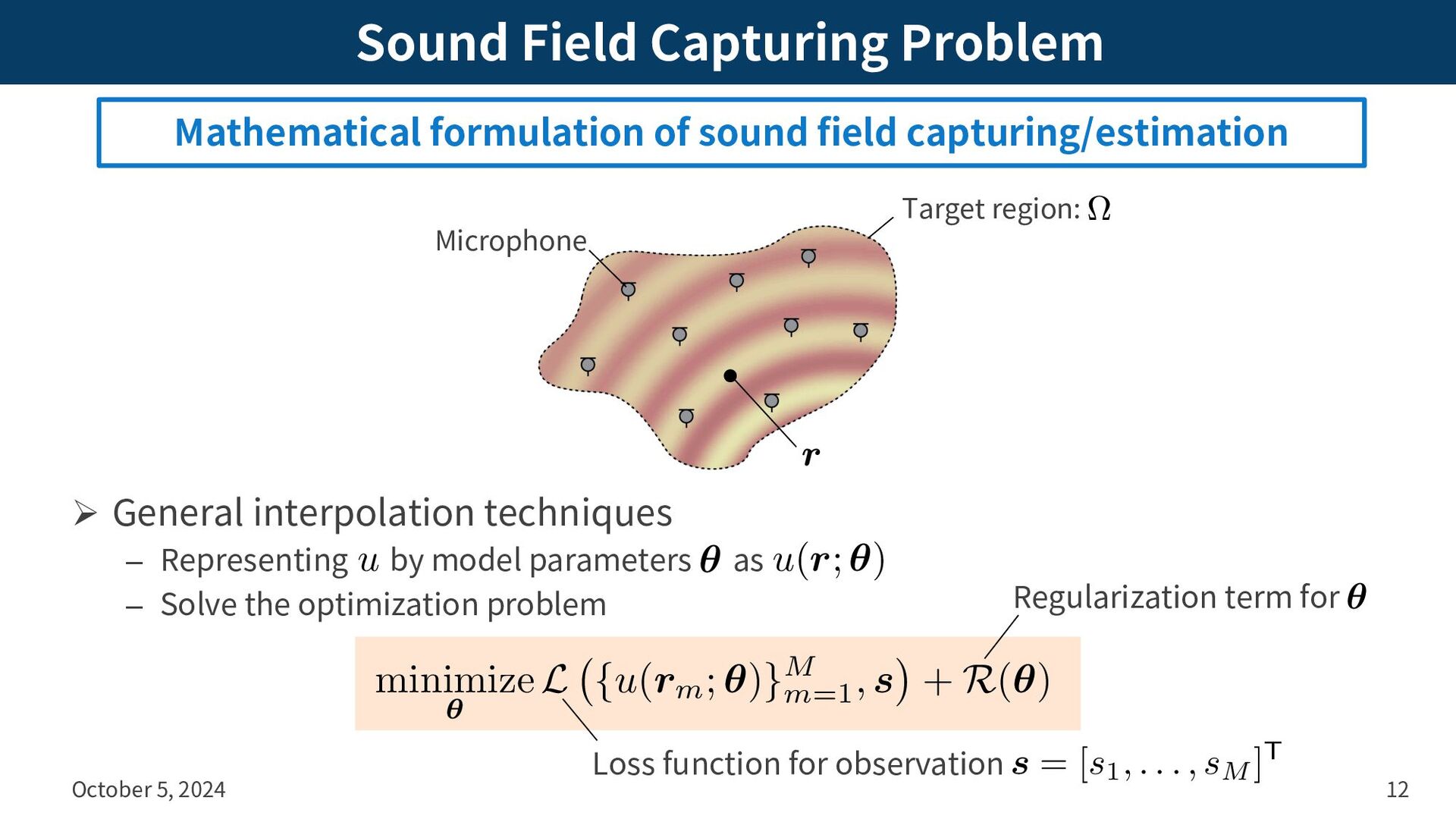 by model parameters as – Solve the optimization problem October 5, 2024 12 Microphone Target region: Mathematical formulation of sound field capturing/estimation <latexit sha1_base64="QB9up2Xq4KtGilt/H+nRpzcDgKk=">AAADJnicfVLdahQxFM6MP63rT3f10pvgImx1WWZEqiBCUS+8sFjFbQubdchkz8yGJjNDkhHXkKfwJXwa70S80zcxM93qtrUeCHx85zv/SSvBtYmiH0F44eKly2vrVzpXr12/sdHt3dzTZa0YjFkpSnWQUg2CFzA23Ag4qBRQmQrYTw+fN/79D6A0L4t3ZlHBVNK84Bln1Hgq6VoiecEl/wSJJam0xMzBUOcwkdTMGRX2lSMCMjPAxOJ60GiUS+QTvKLexMQlVj6N3fudYevQPoHi+dxs4vt/U711g9WopNuPRlFr+CyIl6CPlrab9ILPZFayWkJhmKBaT+KoMlNLleFMgOuQWkNF2SHNYeJhQSXoqW235PBdz8xwVir/CoNbdjXCUqn1QqZe2TSsT/sa8l++SW2yx1PLi6o2ULCjQlktsClxs3I84wqYEQsPKFPc94rZnCrKjD9M50SZVA6b/Epn2k/zAvyUCnY887oCRU2p7llCVS7pR+enzsmwQf8T8uJY6NF5Qp+k/QLO/kHnSpe/xUuPkT9jfPpoZ8Heg1G8Ndp687C//Wx50HV0G91BAxSjR2gbvUS7aIwY+hWsBd2gF34Jv4bfwu9H0jBYxtxCJyz8+RuXLAcP</latexit> minimize ✓ L {u(rm; ✓)}M m=1 , s + R(✓) Loss function for observation Regularization term for <latexit sha1_base64="ru0OGkVwXcC9n3iBv3AvtKvDAnk=">AAACtHicfZFdSxtBFIYnW1vTaFttL71ZDAURCbtSopeh7YU3RQtGhWyQs5OzyeB8LDNnxbjsryi9rb+r/6azMRE/e2Dg4T3vzJyPNJfCURT9bQSvll6/WW6+ba2svnv/YW3944kzheXY50Yae5aCQyk09kmQxLPcIqhU4ml68a3On16idcLoY5rmOFQw1iITHMhLgyRVZUITJKjO19pRJ5pF+BTiObTZPI7O1xu/kpHhhUJNXIJzgzjKaViCJcElVq2kcJgDv4AxDjxqUOiG5azmKvzslVGYGeuPpnCm3r9RgnJuqlLvVEAT9zhXi8/lBgVl+8NS6Lwg1Pz2o6yQIZmwHkA4EhY5yakH4Fb4WkM+AQuc/JhaD75J1U79vnWZ8918R9+lxR9eOczRAhm7XSZgxwquKt/1ONmp6X9GoRdGTy8Z/SNCiWusyjt60Sr0wrogv8b48dKewsluJ+52uj+/tHtf5wttsg22ybZYzPZYjx2wI9ZnnBn2m/1hN0E3SAIe4K01aMzvfGIPItD/AKw13BQ=</latexit> ✓ <latexit sha1_base64="wnDK9ytRrHjhZwyUfqPJAj2Ykik=">AAAC03icfZHLahRBFIZrOlHjeJvo0k3hIAQZhm6R6EYIxoWbYIRMEphum9M1pydF6tJUVUsmRW/ErW58Fbf6Hr6N1ZOZYBLjgYKP//xVdS5FJbh1cfy7E62s3rh5a+12987de/cf9NYf7ltdG4YjpoU2hwVYFFzhyHEn8LAyCLIQeFAcb7f5g09oLNdqz80qzCRMFS85AxekvLeRFtLbhr6mY5snA5qKiXZ2QG2+k330qQR3ZEu/1zR5rx8P43nQq5AsoE8WsZuvd76nE81qicoxAdaOk7hymQfjOBPYdNPaYgXsGKY4DqhAos38vKWGPg3KhJbahKMcnat/3/AgrZ3JIjjnNV7OteK/cuPala8yz1VVO1Ts7KOyFtRp2s6HTrhB5sQsADDDQ62UHYEB5sIUuxe+KeSgfd/Y0oZu3mLo0uBOUN5XaMBp88ynYKYSTprQ9TQdtPQ/I1dLY6DrjOERLvkpNv6crrVytbQuKawxuby0q7D/fJhsDjc/vOhvvVksdI08Jk/IBknIS7JF3pFdMiKMfCM/yE/yKxpFPvocfTmzRp3FnUfkQkRf/wAenuda</latexit> s = [s1, . . . , sM ]T <latexit sha1_base64="bgfM3WFHH+06JgGQdjycQWMo7ww=">AAACwXicfZHBbhMxEIadhUIILU1A6oWLRVSprapoF6GCxKWiPfSCaKWmrZSNollnNrFqe1f2LCIs+xS8AVd4Id6m3jRBtKWMZPnTP//YHk+SK+koDH83ggcPVx49bj5pPV1de7be7jw/c1lhBfZFpjJ7kYBDJQ32SZLCi9wi6ETheXJ5UOfPP6N1MjOnNMtxqGFiZCoFkJdG7Y1iK050aav3vN5jmiJBtT1qd8NeOA9+F6IFdNkijkedxvd4nIlCoyGhwLlBFOY0LMGSFAqrVlw4zEFcwgQHHg1odMNy3kDFN70y5mlm/TLE5+rfFSVo52Y68U4NNHW3c7X4r9ygoPTdsJQmLwiNuL4oLRSnjNe/wcfSoiA18wDCSv9WLqZgQZD/s9aNaxK9W59vXep8N4fou7T40SufcrRAmd0pY7ATDV8q3/Uk3q3pf0ZplkZP9xn9IVLLr1iVf+heqzRL65L8GKPbQ7sLZ6970V5v7+RNd//DYqBN9pK9YlssYm/ZPjtix6zPBPvGfrCf7FdwEMggD+y1NWgsal6wGxGUV4wM4Gk=</latexit> u(r; ✓) <latexit sha1_base64="yLksvcVXn4jdtyNYM7Soz6yW9Ko=">AAACqnicfZHbSgMxEIbT9VxPrV56s1gEkVJ2RaqXRb3wRjxgq9IWmU1nazDJLklWrEufwEv14Xwbs7UVrYeBwMc//yQzmSDmTBvPe8s5E5NT0zOzc/n5hcWl5UJxpaGjRFGs04hH6ioAjZxJrBtmOF7FCkEEHC+Du4Msf3mPSrNIXphejG0BXclCRsFY6Sy5KZS8ijcI9yf4QyiRYZzeFHPPrU5EE4HSUA5aN30vNu0UlGGUYz/fSjTGQO+gi02LEgTqdjrotO9uWKXjhpGyRxp3oH6tSEFo3ROBdQowt3o8l4m/5ZqJCffaKZNxYlDSj4fChLsmcrOx3Q5TSA3vWQCqmO3VpbeggBr7OflvzwSinN2vdKjtNIdop1R4bJWTGBWYSG2lLVBdAQ99O3W3Vc7oPyOTI6Olv4z2EibYI/bTT/rTyuTIOiK7Rn98aT+hsV3xq5Xq2U6ptj9c6CxZI+tkk/hkl9TIETkldUIJkifyQl6dsnPuXDvND6uTG9askm/hdN4Bu6fXkA==</latexit> u <latexit sha1_base64="ru0OGkVwXcC9n3iBv3AvtKvDAnk=">AAACtHicfZFdSxtBFIYnW1vTaFttL71ZDAURCbtSopeh7YU3RQtGhWyQs5OzyeB8LDNnxbjsryi9rb+r/6azMRE/e2Dg4T3vzJyPNJfCURT9bQSvll6/WW6+ba2svnv/YW3944kzheXY50Yae5aCQyk09kmQxLPcIqhU4ml68a3On16idcLoY5rmOFQw1iITHMhLgyRVZUITJKjO19pRJ5pF+BTiObTZPI7O1xu/kpHhhUJNXIJzgzjKaViCJcElVq2kcJgDv4AxDjxqUOiG5azmKvzslVGYGeuPpnCm3r9RgnJuqlLvVEAT9zhXi8/lBgVl+8NS6Lwg1Pz2o6yQIZmwHkA4EhY5yakH4Fb4WkM+AQuc/JhaD75J1U79vnWZ8918R9+lxR9eOczRAhm7XSZgxwquKt/1ONmp6X9GoRdGTy8Z/SNCiWusyjt60Sr0wrogv8b48dKewsluJ+52uj+/tHtf5wttsg22ybZYzPZYjx2wI9ZnnBn2m/1hN0E3SAIe4K01aMzvfGIPItD/AKw13BQ=</latexit> ✓