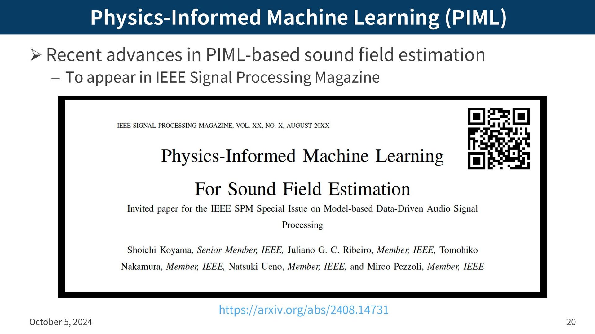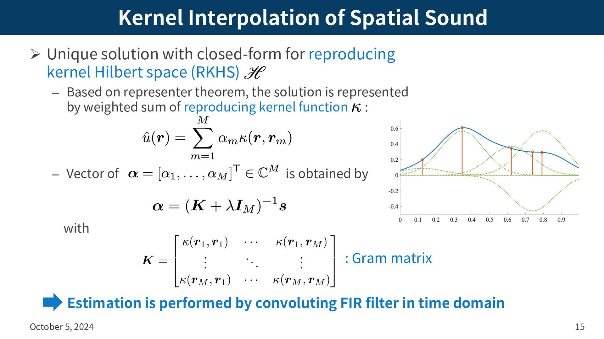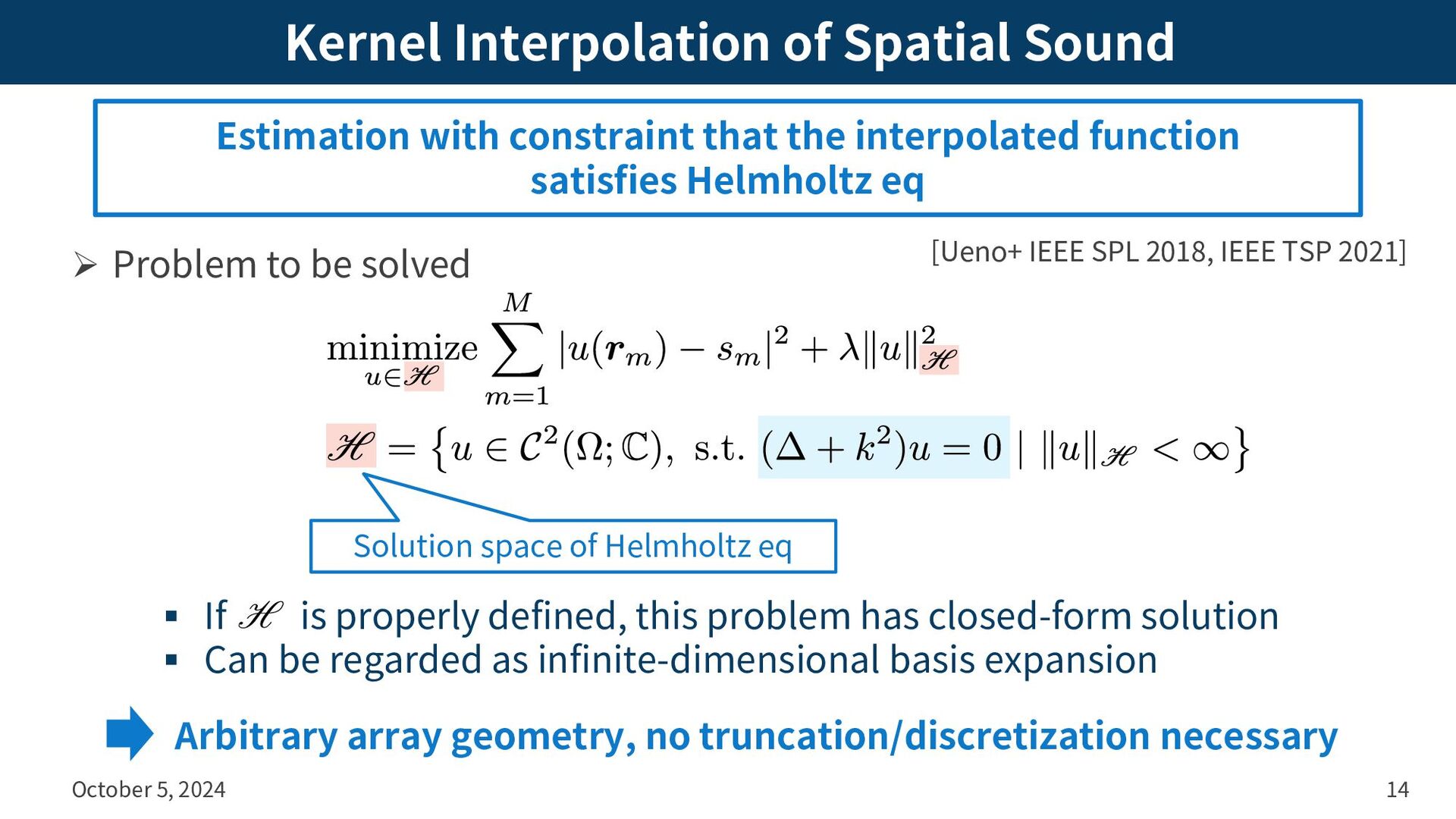 October 5, 2024 14 Estimation with constraint that the interpolated function satisfies Helmholtz eq [Ueno+ IEEE SPL 2018, IEEE TSP 2021] Solution space of Helmholtz eq § If is properly defined, this problem has closed-form solution § Can be regarded as infinite-dimensional basis expansion <latexit sha1_base64="CCNheoHdwk+3+XQETj9IXlSAYTs=">AAACtHicfZHbSsNAEIa38VzPeulNsAgiUhKR6qWoF96IClaFpshkO6mLewi7G7GGPIV4q8/l27iprXgeWPj459/ZmZ045czYIHiteCOjY+MTk1PV6ZnZufmFxaULozJNsUkVV/oqBoOcSWxaZjlepRpBxBwv49uDMn95h9owJc9tL8W2gK5kCaNgndSKBNgbQ3V+VFwv1IJ60A//J4QDqJFBnF4vVh6jjqKZQGkpB2NaYZDadg7aMsqxqEaZwRToLXSx5VCCQNPO+z0X/ppTOn6itDvS+n31840chDE9ETtnv8fvuVL8LdfKbLLbzplMM4uSvj+UZNy3yi8/wO8wjdTyngOgmrlefXoDGqh131T98kwsNsv62iTGTXOIbkqNx045SVGDVXojj0B3BdwXbuputFnSf0Ymh0ZHfxldESbYAxb5B/1pZXJoHZJbY/h9aT/hYqseNuqNs+3a3v5goZNkhaySdRKSHbJHjsgpaRJKFHkiz+TFa3iRRz18t3qVwZ1l8iU8+QacaNwN</latexit> H Arbitrary array geometry, no truncation/discretization necessary