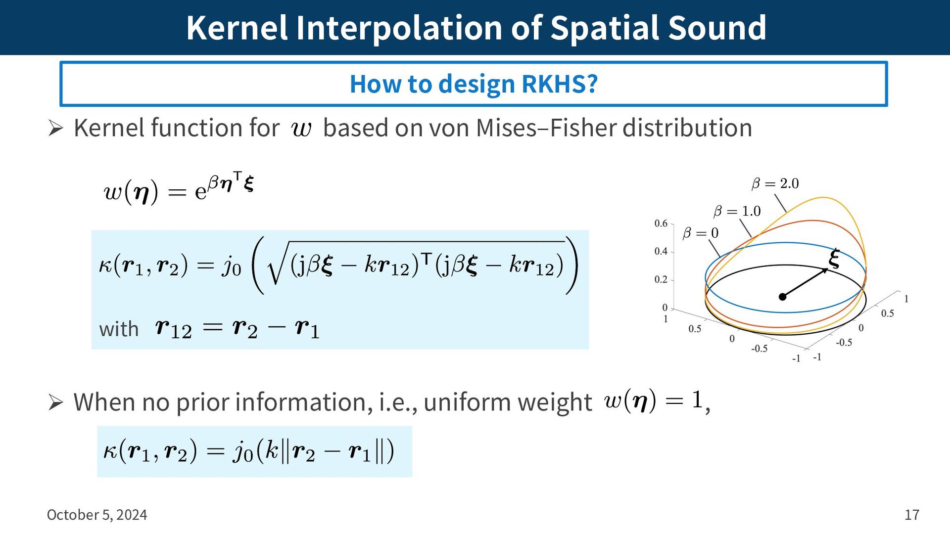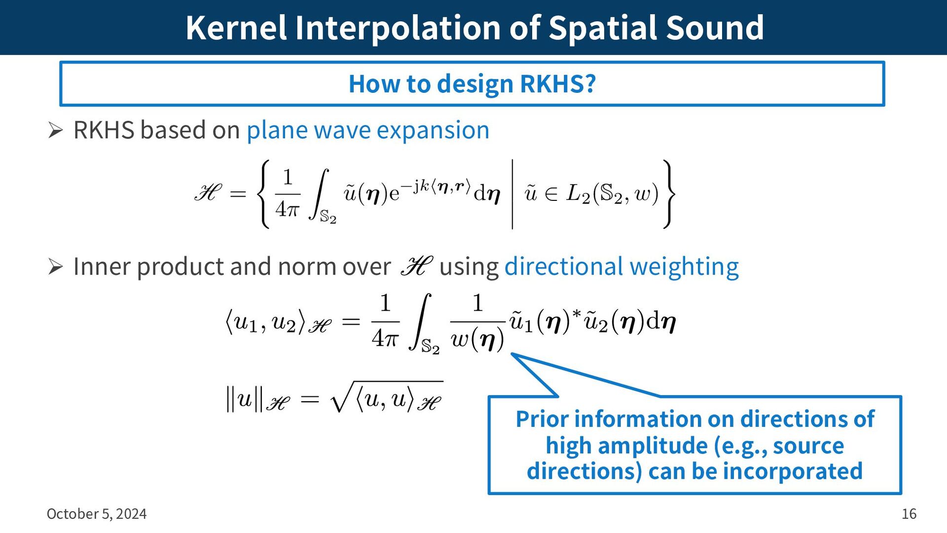 wave expansion Ø Inner product and norm over using directional weighting October 5, 2024 16 How to design RKHS? Prior information on directions of high amplitude (e.g., source directions) can be incorporated <latexit sha1_base64="isRGdCdgAyvToZm2G6zcexSm7tk=">AAADfnicfVFbb9MwGHUWLqPcOnjkxaICdagrTTWN8YA0DR72AGIIuk2qS+S4X1LT2IlsByjGv4KfxhP/Bjdrq10YnxTp5Hznu/kkZc616fX+BGvhtes3bq7faty+c/fe/ebGgyNdVIrBgBV5oU4SqiHnEgaGmxxOSgVUJDkcJ9PX8/zxV1CaF/KTmZUwEjSTPOWMGk/Fzd9EUDPRTNkDh19hkkNqiMUkVZTZyNltUnKHCZcmtrU0SexHF/c9Z3g+Blu5NkmEJWCo28S1RAkL7rPdWv58cVPfmMosB7zSdmqofB9VZ9yqduxWIkww2edZ9nMOlvPm2+C3cb99dp8O/rZJFM8mhri42ep1e3XgyyBagBZaxGG8Efwi44JVAqRhOdV6GPVKM7JUGc78ag1SaSgpm9IMhh5KKkCPbP36Dj/xzBinhfKfNLhmz1ZYKrSeicQr67e+mJuT/8oNK5PujiyXZWVAstNBaZVjU+C5lXjMFTCTzzygTHG/K2YT6o0z3vDGuTGJ6NSvq1Ptr3kD/koF7zzzvgRFTaGeWUJVJuh356/OSGeO/ifkcin06Cqhb8IF/wHOrtCVUi6X0iXyNkYXTbsMjvrdaKe782G7tbe/MHQdPUKPURtF6AXaQwfoEA0QC14GcTAJeIjCp+FW+PxUuhYsah6icxHu/gUg4iX8</latexit> H = ( 1 4⇡ Z S 2 ˜ u(⌘)e jkh⌘,rid⌘ ˜ u 2 L2(S 2, w) )