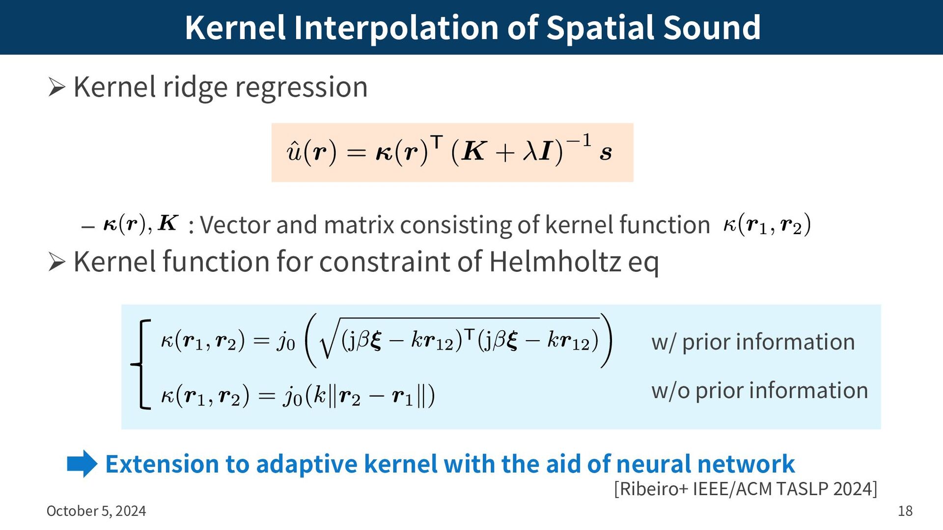 : Vector and matrix consisting of kernel function Ø Kernel function for constraint of Helmholtz eq October 5, 2024 18 Extension to adaptive kernel with the aid of neural network [Ribeiro+ IEEE/ACM TASLP 2024] w/ prior information w/o prior information