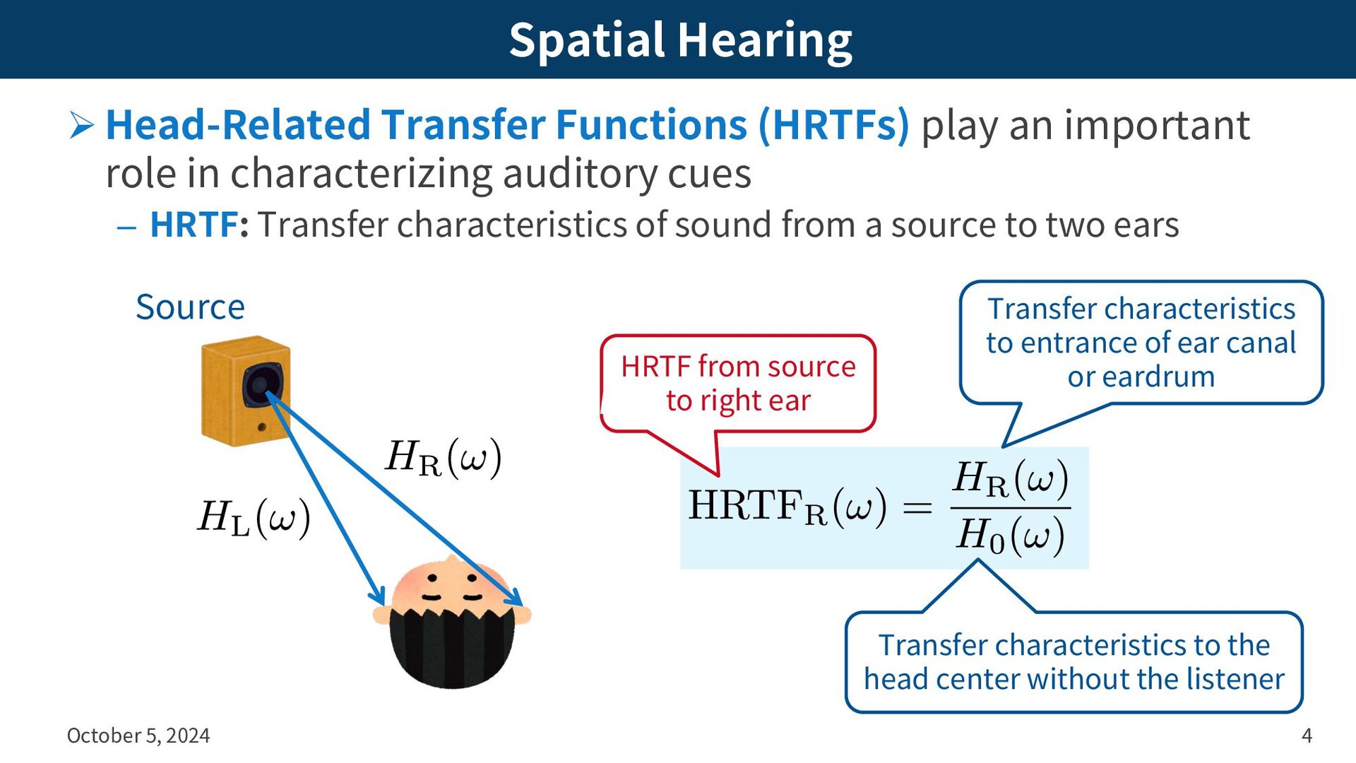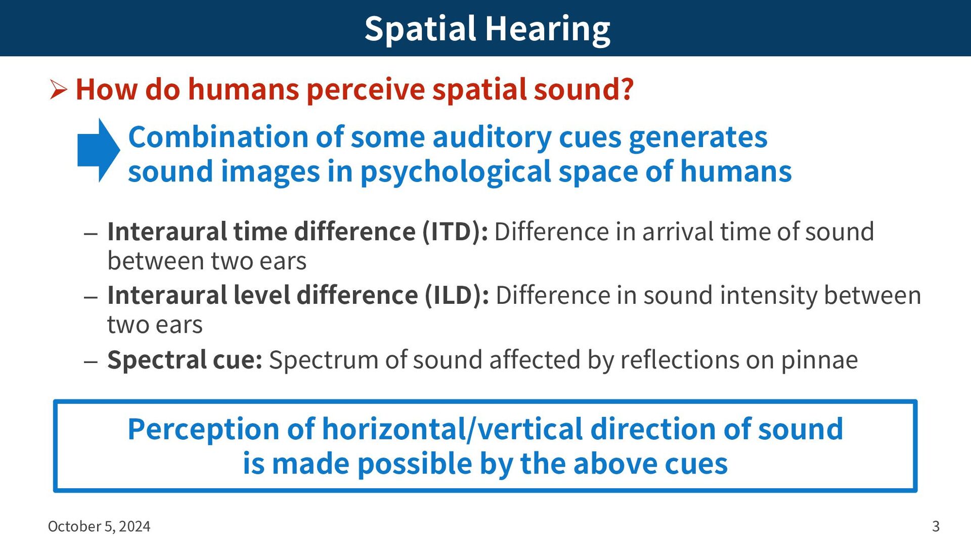 Interaural time difference (ITD): Difference in arrival time of sound between two ears – Interaural level difference (ILD): Difference in sound intensity between two ears – Spectral cue: Spectrum of sound affected by reflections on pinnae October 5, 2024 3 Combination of some auditory cues generates sound images in psychological space of humans Perception of horizontal/vertical direction of sound is made possible by the above cues
