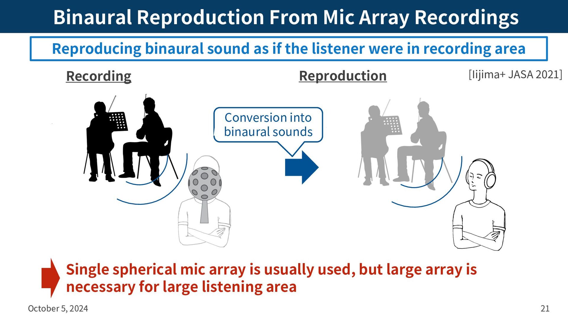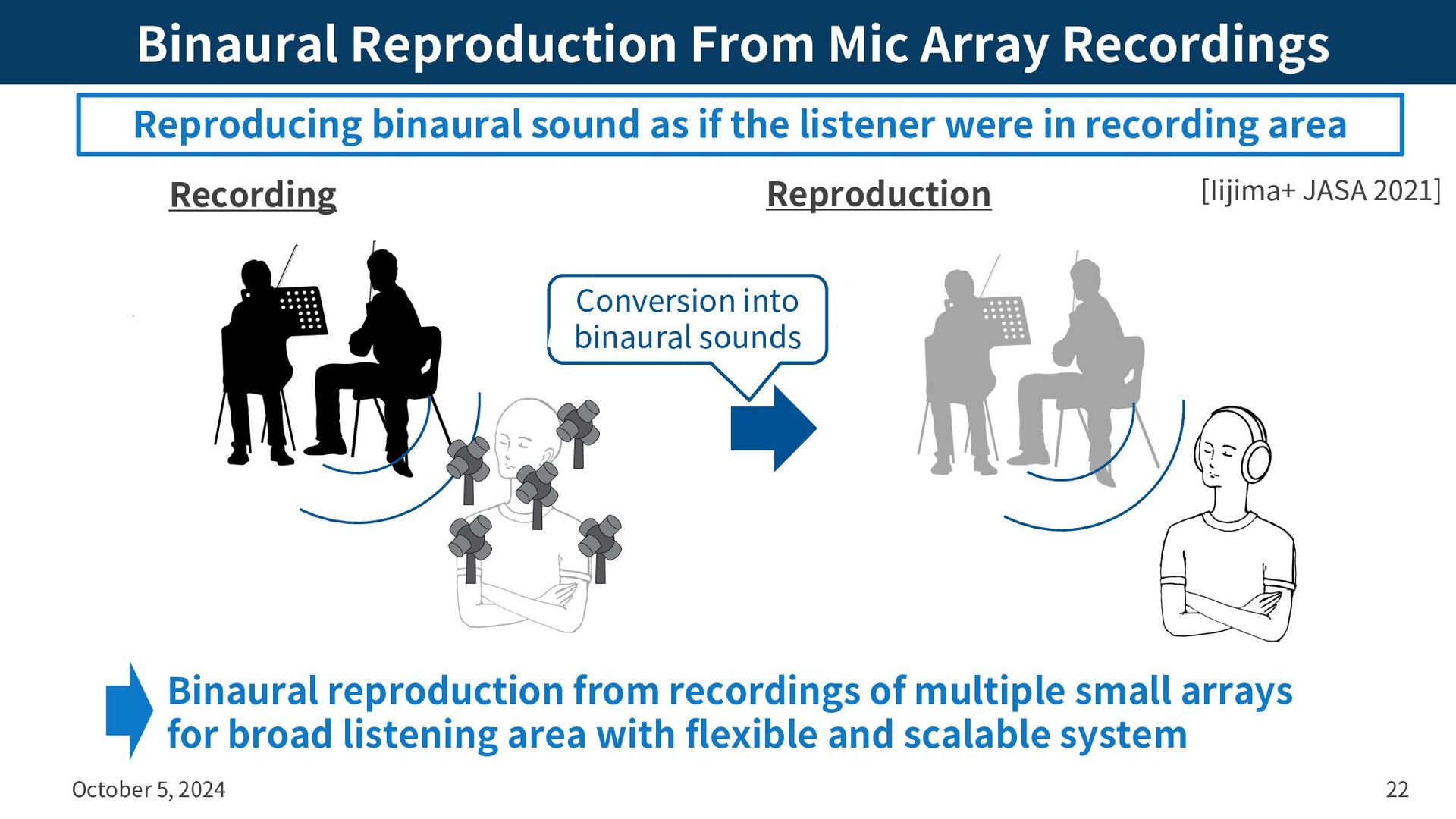 Conversion into binaural sounds Recording Reproduction [Iijima+ JASA 2021] Reproducing binaural sound as if the listener were in recording area Binaural reproduction from recordings of multiple small arrays for broad listening area with flexible and scalable system