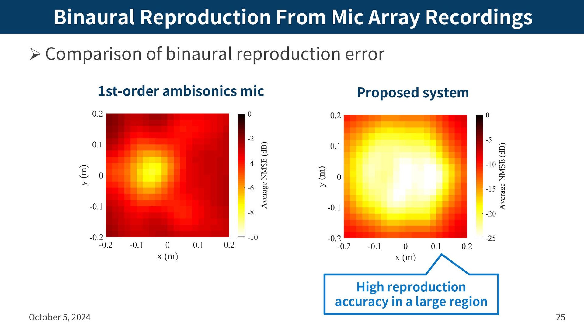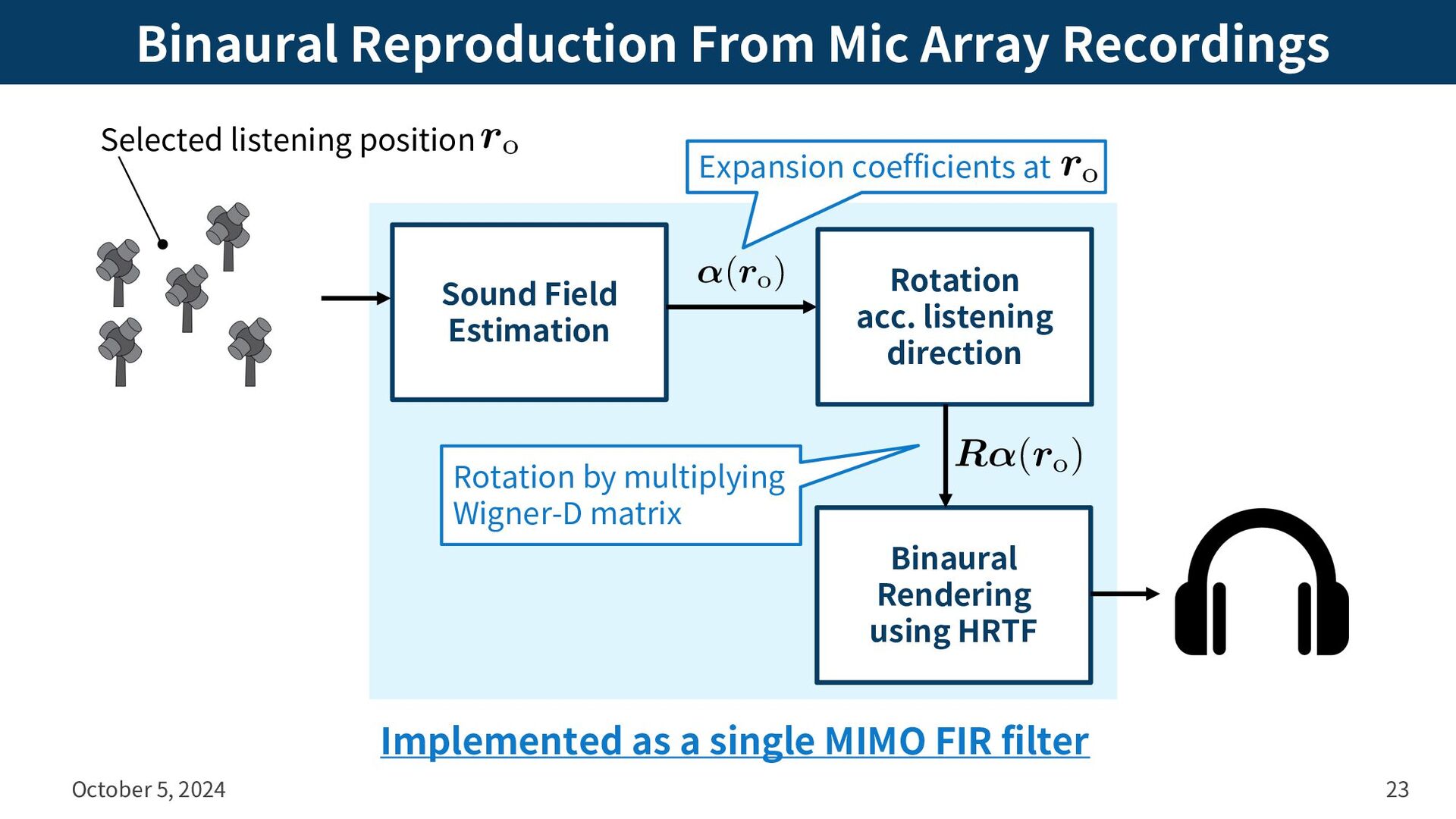 Conversion into binaural sounds Recording Reproduction [Iijima+ JASA 2021] Reproducing binaural sound as if the listener were in recording area Single spherical mic array is usually used, but large array is necessary for large listening area
