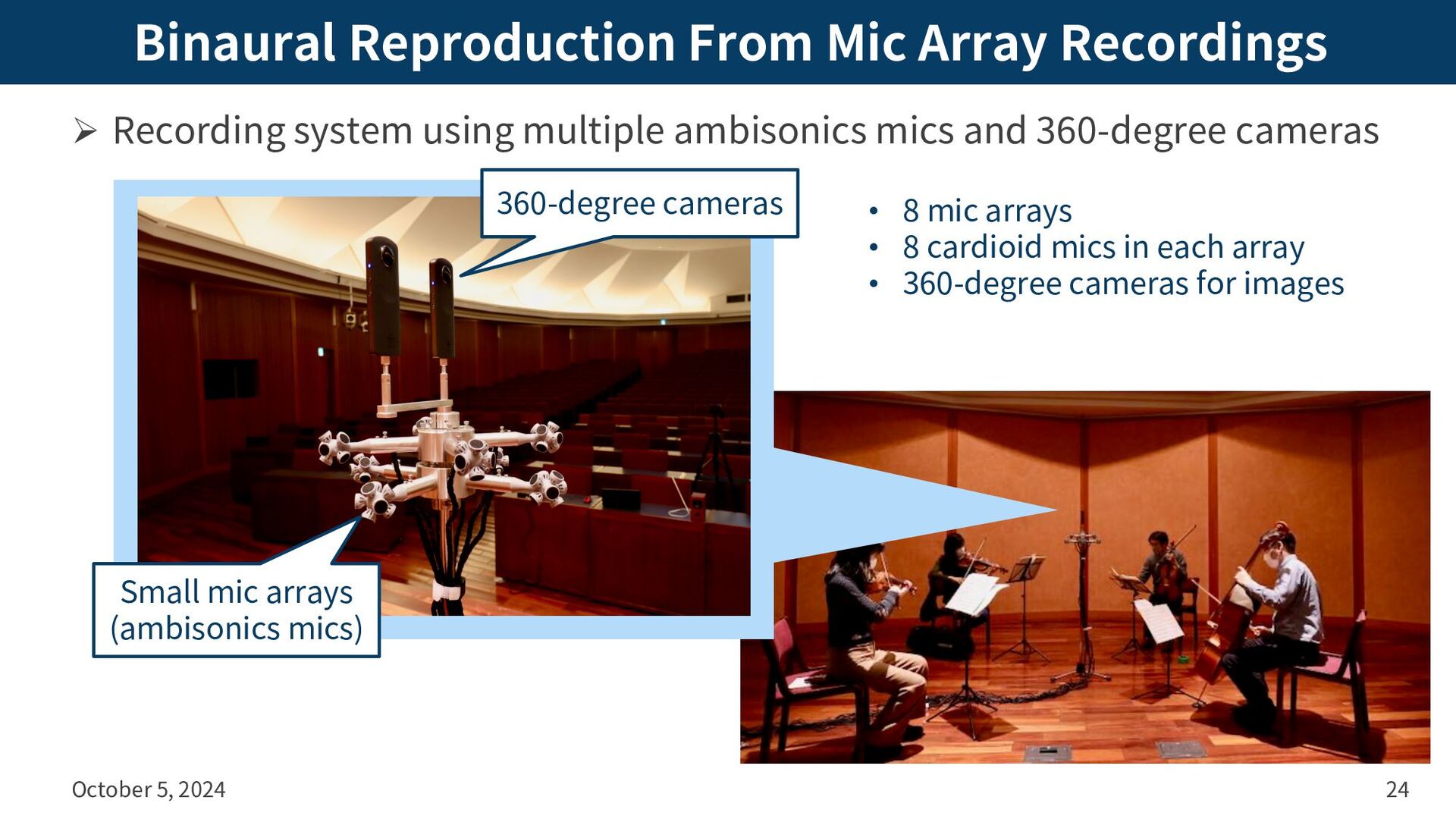 multiple ambisonics mics and 360-degree cameras October 5, 2024 24 Small mic arrays (ambisonics mics) 360-degree cameras • 8 mic arrays • 8 cardioid mics in each array • 360-degree cameras for images
