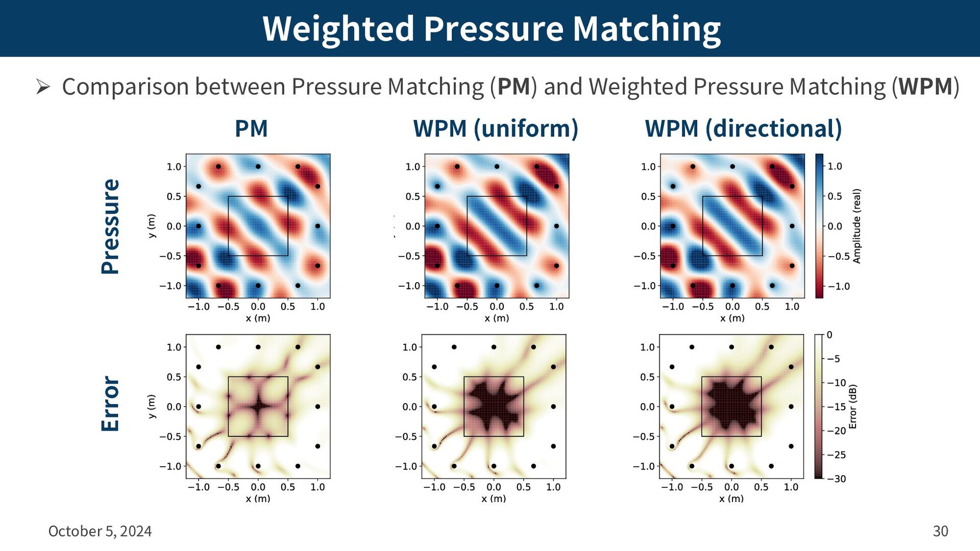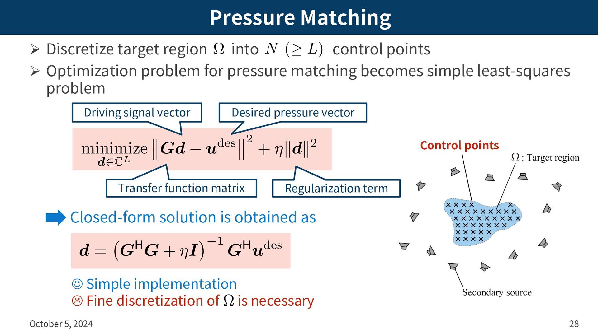 Optimization problem for pressure matching becomes simple least-squares problem October 5, 2024 28 <latexit sha1_base64="V9SycBRbehDy9zsTAA8X3hDIM1c=">AAACpnicfZFLSwMxEMfT9V2f1aOXxSKISNkVUY9FPXjxBbYVukVn0+kaTbJLkhXrsl/Ak1f9Zn4b09qK74HAj//8k5nJhAln2njea8EZGR0bn5icKk7PzM7NL5QW6zpOFcUajXmsLkLQyJnEmmGG40WiEETIsRHe7vfyjTtUmsXy3HQTbAmIJOswCsZK9eBEYASXC2Wv4vXD/Qn+AMpkEKeXpcJj0I5pKlAaykHrpu8lppWBMoxyzItBqjEBegsRNi1KEKhbWb/d3F21StvtxMoeady++vlGBkLrrgitU4C51t9zPfG3XDM1nd1WxmSSGpT0vVAn5a6J3d7sbpsppIZ3LQBVzPbq0mtQQI39oS9VQpEXi8EB2uEUHtlCJwkqMLFazwJQkYD73A4bBRs9+s/I5NBo6S+jfYQJ9oB59kF/WpkcWodkt+d/39VPqG9W/O3K1tlWubo32OMkWSYrZI34ZIdUySE5JTVCyQ15Is/kxVlzjp2a03i3OoXBnSXyJZyrN7rP1cY=</latexit> ⌦ <latexit sha1_base64="q0uECYVB1NlCDNpVOene+1Qk19c=">AAACq3icfZFLTxsxEMedpVBIeXPkYhFVggqi3QoBR0Q5cKAF1AZQsxGadSYbCz9WtheRrvYLcOcKn6vfpk5IKt4jWfpp5j+eV5IJbl0Y/q0EYx/GJz5OTlU/Tc/Mzs0vLJ5anRuGDaaFNucJWBRcYcNxJ/A8MwgyEXiWXH7rx8+u0Fiu1S/Xy7AlIVW8wxk472r+oDFdjVOkh2sX87WwHg6MvoRoCDUytOOLhcpN3NYsl6gcE2BtMwoz1yrAOM4EltU4t5gBu4QUmx4VSLStYtBzST97T5t2tPFPOTrwPs4oQFrbk4lXSnBd+zzWd74Wa+aus9MquMpyh4o9FOrkgjpN+wugbW6QOdHzAMxw3ytlXTDAnF/TkyqJLKvVeB/9cAa/+0JHGRpw2nwpYjCphOvSD5vG6316T8jVSOjpLaH/hEv+B8viP70p5WokHZG/XvT8Vi/h9Gs92qpvnmzWdveGd5wky2SFrJKIbJNdckCOSYMwosktuSP3wUbwM/gdxA/SoDLMWSJPLMB/tKXWgg==</latexit> N ( L) <latexit sha1_base64="Sfob4tqImS+gkH7eBMlgYAHh4Uo=">AAADDnicfZJNb9QwEIad8FWWj27hyMVihYT4WCVVRXusKBIcQBSJbSutd1eOd5K1ajuR7SCWkD/AiV/DDXHlzI1/wpFJmiLaUkaK9OqdZzweT5JCSeej6GcQXrh46fKVlau9a9dv3Fztr93ac3lpBYxErnJ7kHAHShoYeekVHBQWuE4U7CeHO01+/x1YJ3Pz1i8LmGieGZlKwT1as75iWhqp5QeYVSzR1bymTBrKNPeLJKl26ulLdBSknn2kDfAcicetKutp1XIWy8DVyFmZLRCcrtOHlIHntCtqTkV31h9Ew6gNelbEnRiQLnZna8EnNs9FqcF4obhz4zgq/KTi1kuhoO6x0kHBxSHPYIzScA1uUrXPUtN76Mxpmlv8jKet+3dFxbVzS50g2YzhTuca81+5cenTrUklTVF6MOKoUVoq6nPavDGdSwvCqyUKLqzEu1Kx4JYLj5s40SXRda/HngEOZ+EVNnpdgOU+tw8qxm2m+fsah83Yo0b9D5TmGER1HoiHtKuuqz/qXLT7KxA9Vri9+PSuzoq99WH8ZLjxZmOw/bTb4wq5Q+6S+yQmm2SbvCC7ZEQE+UF+BUEQhp/DL+HX8NsRGgZdzW1yIsLvvwHgg/35</latexit> minimize d2CL Gd udes 2 + ⌘kdk2 <latexit sha1_base64="i9WfaOjLrhWO59r+nVt9MC7/SLM=">AAADEHicfZHLbhMxFIY90wIlXJrCko1FhFRu0QyqgA1SBUiUBaJIpK0Up5HHOTOxantGtgcRLL8AS56GHWLLmg2vwgrPJEH0xpEsff7Pf3xsn6wS3Ngk+RXFK6sXLl5au9y5cvXa9fXuxo09U9aawYCVotQHGTUguIKB5VbAQaWBykzAfnb0osnvfwBteKne21kFI0kLxXPOqA3SuKtIJt3E42eYCMjtJm72r/yhI5LaqcndjvdzCd/HBCxtDa89JpoXU3v30D1M/VlFrVYvNR2agPF+3O0l/aQNfBrSBfTQInbHG9FnMilZLUFZJqgxwzSp7MhRbTkT4DukNlBRdkQLGAZUVIIZufZjPL4TlAnOSx2WsrhV/61wVBozk1lwtjc/mWvEs3LD2uZPR46rqrag2LxRXgtsS9z8Mp5wDcyKWQDKNA93xWxKNWU2zOJYl0z6Toe8hPA4DW9Co7cVaGpLfc8RqgtJP/rw2II8aOh/Rq6WxkDnGcMhXPJP4N1fOtfK1dK6pDC99OSsTsPeo376uL/1bqu3/XwxxzV0C91GmyhFT9A22kG7aIAY+ol+RyvRavwl/hp/i7/PrXG0qLmJjkX84w9/cP+K</latexit> d = GHG + ⌘I 1 GHudes Transfer function matrix Driving signal vector Desired pressure vector Regularization term Closed-form solution is obtained as J Simple implementation L Fine discretization of is necessary <latexit sha1_base64="V9SycBRbehDy9zsTAA8X3hDIM1c=">AAACpnicfZFLSwMxEMfT9V2f1aOXxSKISNkVUY9FPXjxBbYVukVn0+kaTbJLkhXrsl/Ak1f9Zn4b09qK74HAj//8k5nJhAln2njea8EZGR0bn5icKk7PzM7NL5QW6zpOFcUajXmsLkLQyJnEmmGG40WiEETIsRHe7vfyjTtUmsXy3HQTbAmIJOswCsZK9eBEYASXC2Wv4vXD/Qn+AMpkEKeXpcJj0I5pKlAaykHrpu8lppWBMoxyzItBqjEBegsRNi1KEKhbWb/d3F21StvtxMoeady++vlGBkLrrgitU4C51t9zPfG3XDM1nd1WxmSSGpT0vVAn5a6J3d7sbpsppIZ3LQBVzPbq0mtQQI39oS9VQpEXi8EB2uEUHtlCJwkqMLFazwJQkYD73A4bBRs9+s/I5NBo6S+jfYQJ9oB59kF/WpkcWodkt+d/39VPqG9W/O3K1tlWubo32OMkWSYrZI34ZIdUySE5JTVCyQ15Is/kxVlzjp2a03i3OoXBnSXyJZyrN7rP1cY=</latexit> ⌦ : Target region Secondary source Control points