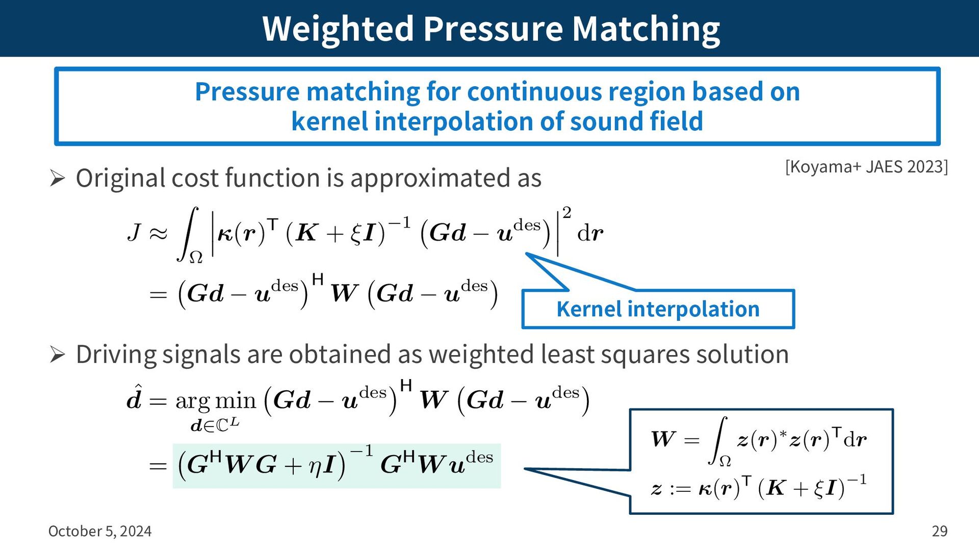 Ø Driving signals are obtained as weighted least squares solution October 5, 2024 29 Pressure matching for continuous region based on kernel interpolation of sound field <latexit sha1_base64="ots8Wmdw3c6kEAqnCoYqjjAHV2E=">AAAD0HiclVJbb9MwFHYWLqNctsEjL9YqpgJb1UwT8II0ARIDhDbQuk6au8pxT1KrcRLZDmrJLMQjvPM7eIWfwr/BSdOKbhSJIyX+9J3v3HzspxFXutX65Sy5ly5fubp8rXb9xs1bK6trt49UkkkGbZZEiTz2qYKIx9DWXEdwnEqgwo+g4w+fF/7OB5CKJ/GhHqfQFTSMecAZ1ZbqrTnrr/EGoWkqkxEmPNa9nOwLCKnBJIJAn2Hii5wMrYKaRoGluX+aE0H1QAX5oal0jVL3xjwkI16gV5aXPBxoK97y5kQvTfHvm63iyEyVTFoKlJmFVefZ6Tae+c2kPiaktvG0SllmXJRs1sK0372igFV2zH+E91brrWarNHwReBWoo8oO7K1+I/2EZQJizSKq1InXSnU3p1JzFoGpkUxBStmQhnBiYUwFqG5ebtPge5bp4yCR9os1Ltk/I3IqlBoL3yrLqc77CvJvvpNMB0+6OY/TTEPMJoWCLMI6wcXTwH0ugelobAFlktteMRtQSZm2D6g2V8YXm+VFqUAZ63kBdkwJby21n4KkOpEPckJlKOjI2LFDslmgfwl5PBVatEhok3DBP4LJZ2ihlMdT6RTV7CK982u7CI62m96j5s67nfrus2qly+guWkcN5KHHaBftoQPURsz54nx3fjg/3ffuyP3kfp5Il5wq5g6aM/frbwuZR80=</latexit> J ⇡ Z ⌦ (r)T (K + ⇠I) 1 Gd udes 2 dr = Gd udes H W Gd udes <latexit sha1_base64="wBoAciZ2FK9Swr355ix7ob1QUvE=">AAADEnicfZHLbtNAFIYn5lbCLYUlmxERUkEosqsK2CBVLQs2qEVqmoo4RMeTY3dUz9iaGVdNR/MWPADPwQrElhfgBdjCIzB2EkR64UiWP/3nn9t/kjLn2oThj1Zw5eq16zdWbrZv3b5z915n9f6+LirFsM+KvFAHCWjMucS+4SbHg1IhiCTHQXK0XfcHx6g0L+SemZY4EpBJnnIGxkvjzvs4EXbg6Csac2nGNt4RmIGjtXzq1uqfck8+2Bi0uUAVYA51avec79WshJ3MbMqNO92wFzZFz0M0hy6Z1+54tfUpnhSsEigNy0HrYRSWZmRBGc5ydO240lgCO4IMhx4lCNQj24Tg6GOvTGhaKP9JQxv13xUWhNZTkXhnc+uzvVq8qDesTPpyZLksK4OSzQ5Kq5yagtaJ0glXyEw+9QBMcX9Xyg5BATM+96VTErH0BtskplPt2u34NfonK3zrpZ0SFZhCPfWpq0zAifMRZPGzmv5n5HJh9HSZ0W/CBT9FZ//SpVYuF9YF+ZlGZyd4HvbXe9Hz3sa7je7m1ny6K+QheUTWSERekE3yhuySPmHkC/lJfpHfwcfgc/A1+DazBq35mgdkqYLvfwAs/wN9</latexit> W = Z ⌦ z(r)⇤z(r)Tdr <latexit sha1_base64="UqfxQe3UGsqqnmcvxH4VBmwhEN8=">AAAC/XicfZFdaxNBFIYn61eNH03rpTeDQYhaQ1aKFkEo6oUiYoSmLWRjODs5uxkyM7vMzErTZfBX+BO8Ey/1twje6u9wdpuIba0HBh7e952PMyfOBTe21/veCM6dv3Dx0srl5pWr166vttbWd01WaIYDlolM78dgUHCFA8utwP1cI8hY4F48e1b5e+9RG56pHTvPcSQhVTzhDKyXxq1+FMvy0NHHT2hF0QzyHFynYu3uvCsjCXZqknLHORoJTGynzr1y92h0wCt86Q3N06n16fuhG7favW6vLnoawgW0yaL647XGx2iSsUKiskyAMcOwl9tRCdpyJtA1o8JgDmwGKQ49KpBoRmXduqO3vTKhSab9UpbW6t87SpDGzGXsk3UnJ71K/Jc3LGyyNSq5yguLih1dlBSC2oxW/0gnXCOzYu4BmOb+rZRNQQOz/rebx66J5UZ1vjaJcd55jr5Nja+99CZHDTbTd8sIdCrhwPm202ijov8FuVoGPZ0V9IdwyQ/RlX/ozChXy+iSmn6Q4cmxnYbdB93wYXfz7WZ7++lipCvkJrlFOiQkj8g2eUH6ZEAY+Up+kJ/kV/Ah+BR8Dr4cRYPGYs8NcqyCb78Bcfj4Dw==</latexit> z := (r)T (K + ⇠I) 1 Kernel interpolation [Koyama+ JAES 2023] <latexit sha1_base64="CRJvQ0OuNgbbSk0jTZw5dDlZAo8=">AAADxHiclVJbaxNBFJ7teqnx0ovgiy+DQanahqyU6otQrNgKihVMU8ikYXZyNhk6M7vMzIpxGf+Fv8BX/UH+G2e3G0nbRPDAwrff+c5tzokzwY1tt38HS+GVq9euL99o3Lx1+87K6tr6kUlzzaDDUpHq45gaEFxBx3Ir4DjTQGUsoBuf7pX+7mfQhqfqk51k0Jd0pHjCGbWeGqwF98iY2oLEshg6hx+9xITqkeRqUHOEK0wkteM4LvbcyTuHiYDEbuDSvT90eKtCuTspKpn2QWB8KqL5aGwf17RJioOS9NLu/6bAhDTKxmaC3Jy0+w4/xQQsLf/ezjSwFbnFUW5+7cFqs91qV4Yvg6gGTVTboX/J72SYslyCskxQY3pRO7P9gmrLmQDXILmBjLJTOoKeh4pKMP2i2qDDDz0zxEmq/acsrtjZiIJKYyYy9spqgIu+kpzn6+U2edEvuMpyC4qdFUpygW2Ky3PAQ66BWTHxgDLNfa+YjammzPqjaZwrE8vN6oVMYpz3vAY/pob3nvqQgaY21U+K6njoF+fHHpHNEv1LyNVU6NEioU/CJf8KrviLFkq5mkqnqOEXGV1c22Vw9KwV7bS2P243d1/VK11G99EDtIEi9BztogN0iDqIBS74EfwMfoVvQhGaMD+TLgV1zF10zsJvfwD8G0Dj</latexit> ˆ d = arg min d2CL Gd udes H W Gd udes = GHW G + ⌘I 1 GHW udes