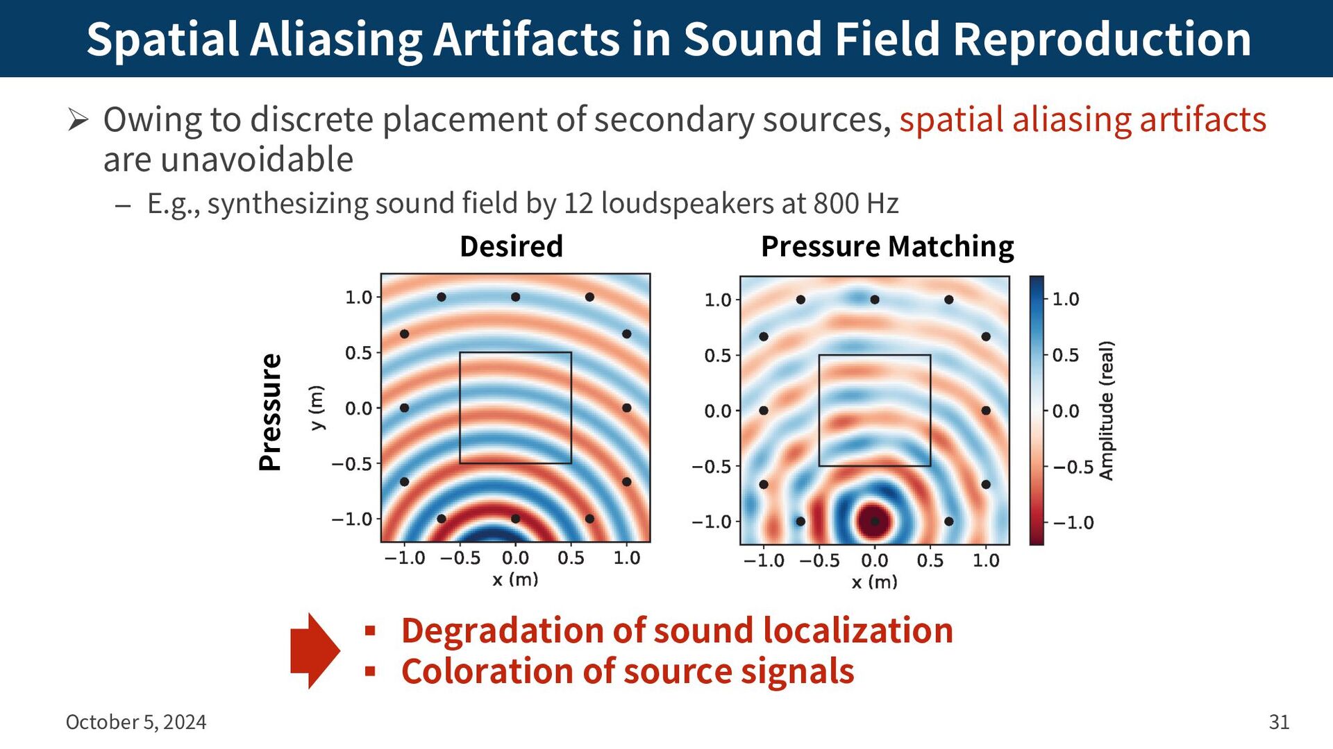discrete placement of secondary sources, spatial aliasing artifacts are unavoidable – E.g., synthesizing sound field by 12 loudspeakers at 800 Hz October 5, 2024 31 Desired Pressure Matching Pressure § Degradation of sound localization § Coloration of source signals
