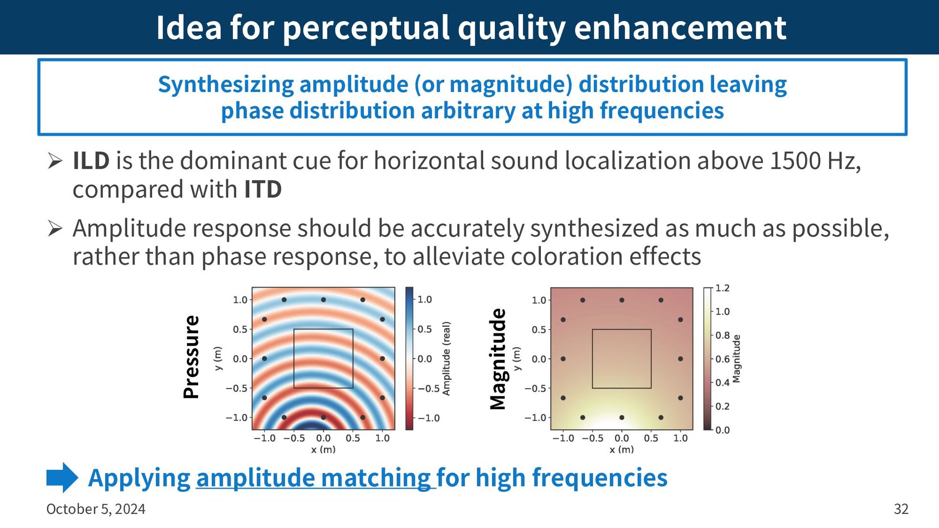 cue for horizontal sound localization above 1500 Hz, compared with ITD Ø Amplitude response should be accurately synthesized as much as possible, rather than phase response, to alleviate coloration effects October 5, 2024 32 Synthesizing amplitude (or magnitude) distribution leaving phase distribution arbitrary at high frequencies Applying amplitude matching for high frequencies Pressure Magnitude
