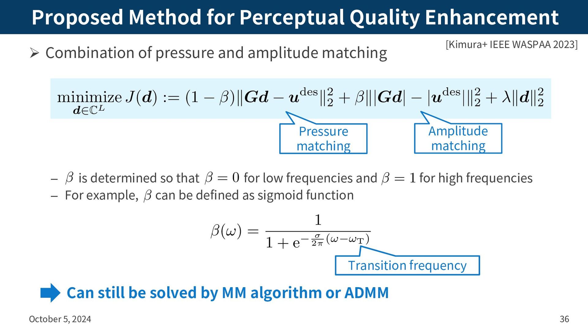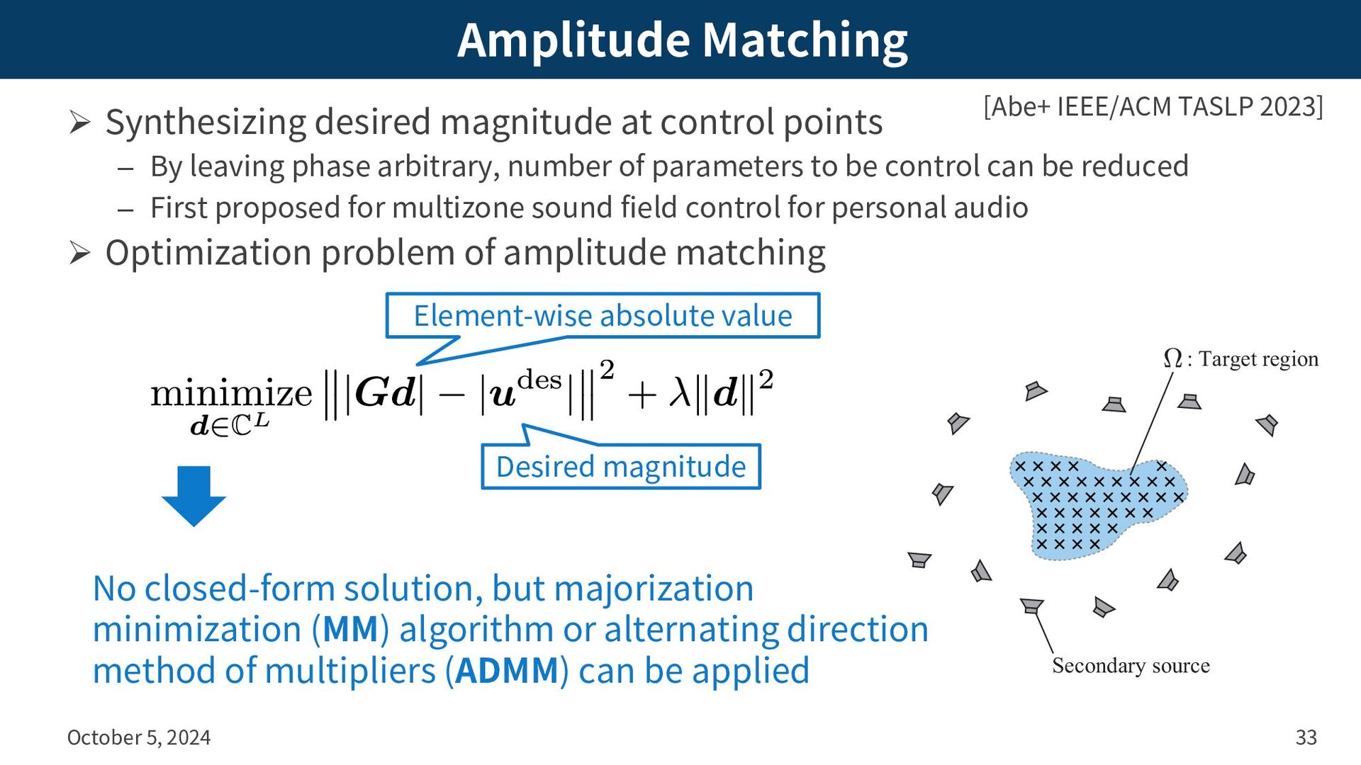 By leaving phase arbitrary, number of parameters to be control can be reduced – First proposed for multizone sound field control for personal audio Ø Optimization problem of amplitude matching October 5, 2024 33 [Abe+ IEEE/ACM TASLP 2023] : Target region Secondary source Desired magnitude No closed-form solution, but majorization minimization (MM) algorithm or alternating direction method of multipliers (ADMM) can be applied Element-wise absolute value