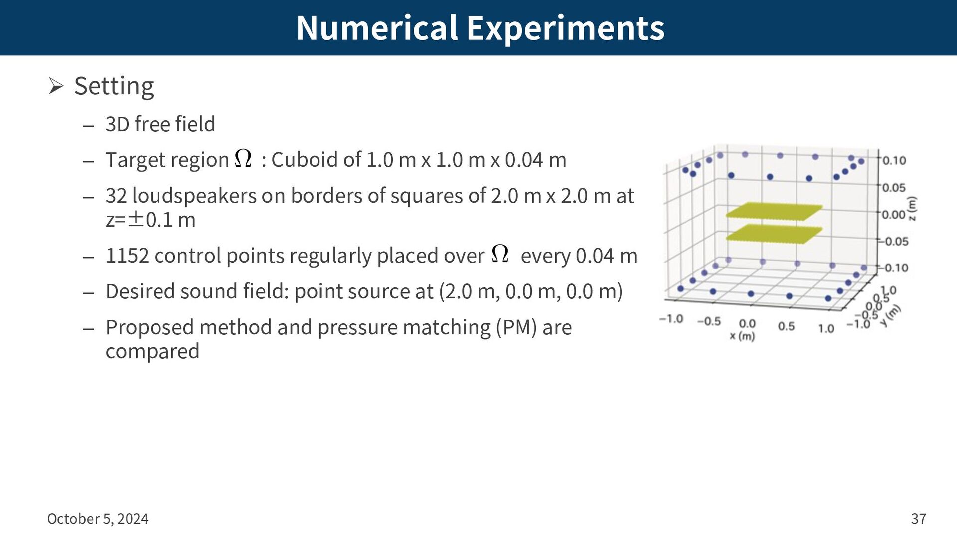 region : Cuboid of 1.0 m x 1.0 m x 0.04 m – 32 loudspeakers on borders of squares of 2.0 m x 2.0 m at z=±0.1 m – 1152 control points regularly placed over every 0.04 m – Desired sound field: point source at (2.0 m, 0.0 m, 0.0 m) – Proposed method and pressure matching (PM) are compared October 5, 2024 37 <latexit sha1_base64="aJVm6ibCtbqRlu7KgruECMVr7Qw=">AAACvHicfZFNT+MwEIbdwAJbdvk87iWiQkJoVSUIASeEgAMXVFaiBamp0MSdBFPbiWwHUaL8B65w4m/xb3D6saJ8jWTp0TuvPTOeMOVMG897qThT0z9mZud+Vud//V5YXFpeaekkUxSbNOGJugxBI2cSm4YZjpepQhAhx4uwd1TmL25RaZbIc9NPsSMglixiFIyVWkFDYAxXSzWv7g3C/Qj+CGpkFGdXy5XnoJvQTKA0lIPWbd9LTScHZRjlWFSDTGMKtAcxti1KEKg7+aDdwl23SteNEmWPNO5AfXsjB6F1X4TWKcBc6/e5Uvws185MtNfJmUwzg5IOC0UZd03ilrO7XaaQGt63AFQx26tLr0EBNfaHJqqEYmKGvKyldKSLajU4RjuywlMrNVJUYBK1mQegYgF3hf2COPhb0ndGJsdGS18Z7SNMsHss8v/0pZXJsXVMdqf++w1+hNZW3d+pb//brh0cjrY7R/6QNbJBfLJLDsgJOSNNQskNeSCP5MnZd7pOzxFDq1MZ3VklE+HcvgLkeN8p</latexit> ⌦ <latexit sha1_base64="aJVm6ibCtbqRlu7KgruECMVr7Qw=">AAACvHicfZFNT+MwEIbdwAJbdvk87iWiQkJoVSUIASeEgAMXVFaiBamp0MSdBFPbiWwHUaL8B65w4m/xb3D6saJ8jWTp0TuvPTOeMOVMG897qThT0z9mZud+Vud//V5YXFpeaekkUxSbNOGJugxBI2cSm4YZjpepQhAhx4uwd1TmL25RaZbIc9NPsSMglixiFIyVWkFDYAxXSzWv7g3C/Qj+CGpkFGdXy5XnoJvQTKA0lIPWbd9LTScHZRjlWFSDTGMKtAcxti1KEKg7+aDdwl23SteNEmWPNO5AfXsjB6F1X4TWKcBc6/e5Uvws185MtNfJmUwzg5IOC0UZd03ilrO7XaaQGt63AFQx26tLr0EBNfaHJqqEYmKGvKyldKSLajU4RjuywlMrNVJUYBK1mQegYgF3hf2COPhb0ndGJsdGS18Z7SNMsHss8v/0pZXJsXVMdqf++w1+hNZW3d+pb//brh0cjrY7R/6QNbJBfLJLDsgJOSNNQskNeSCP5MnZd7pOzxFDq1MZ3VklE+HcvgLkeN8p</latexit> ⌦