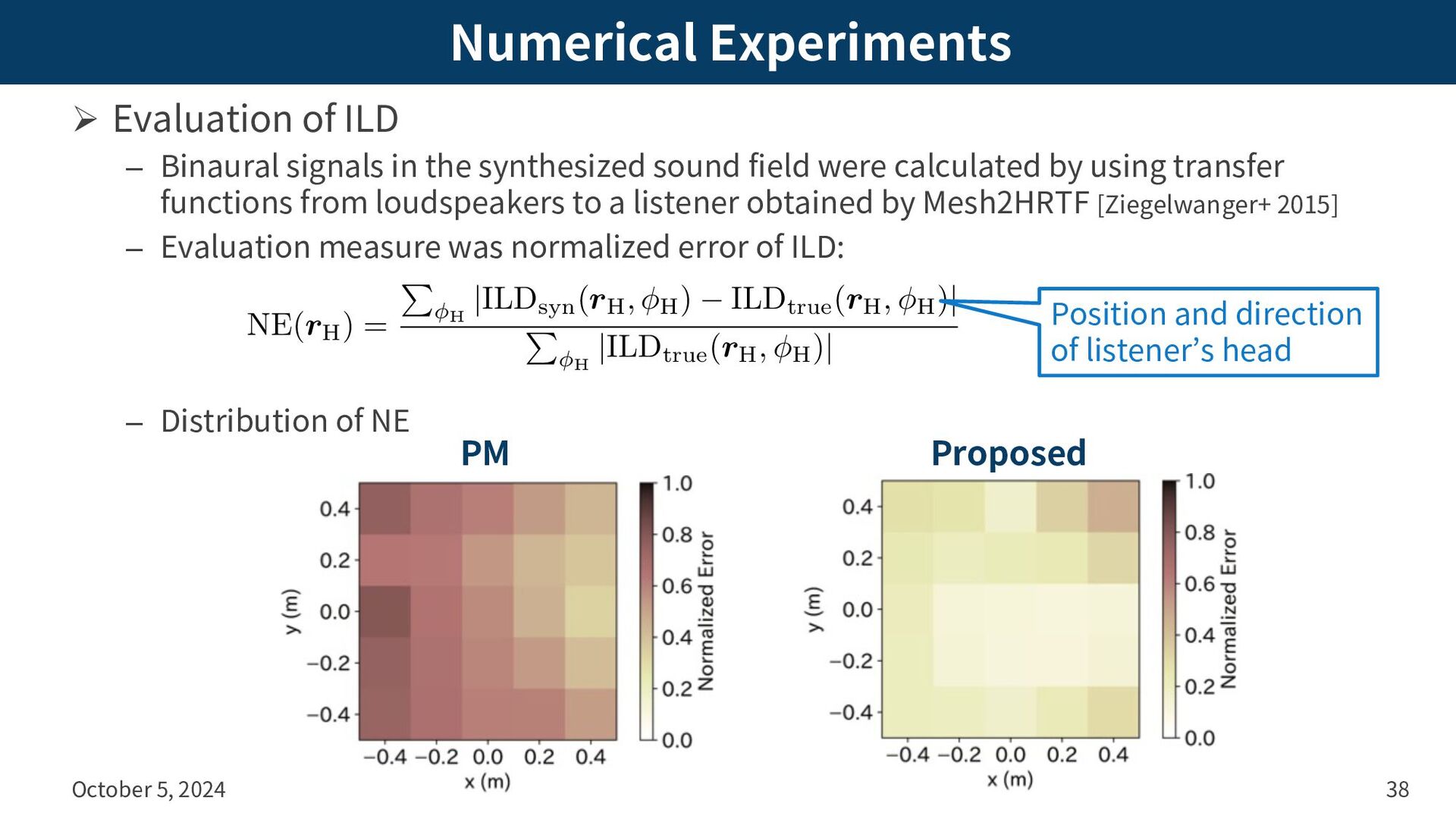 the synthesized sound field were calculated by using transfer functions from loudspeakers to a listener obtained by Mesh2HRTF [Ziegelwanger+ 2015] – Evaluation measure was normalized error of ILD: – Distribution of NE October 5, 2024 38 <latexit sha1_base64="EndMQejlYdBkvqIegxmgN2TX4IM=">AAAD5niclVLdatRAFJ40amv8a+ulN4OL0Eq7JFLa3hSKVqjgTwW3LWyWZTJ7sjs0MwkzE3Gdzit4pXjb5/BWX8K3cbLdSLe7FXsg8OU73/mZc05SZEzpMPztzfk3bt6aX7gd3Ll77/6DxaXlQ5WXkkKL5lkujxOiIGMCWprpDI4LCYQnGRwlJy8q/9FHkIrl4oMeFtDhpC9YyijRjuoueesxJ3oguXn70q7ECTfSdk3N7Vu7indwEKeSUBOrkjtfMWATCotP679Xr/cuRKuhsDNzrk3lWF2fnULLEv47xym21+7xegVsd7ERNsOR4WkQjUEDje3ADfgs7uW05CA0zYhS7SgsdMcQqRnNwAZxqaAg9IT0oe2gIBxUx4wWa/ETx/Rwmkv3CY1H7MUIQ7hSQ544ZdWmuuyryFm+dqnT7Y5hoig1CHpeKC0zrHNcXQnuMQlUZ0MHCJXM9YrpgLgj0O6WJqokfOINZjQulSobBPEeuCdLeOOodwVIonP51MRE9jn5ZN0I+vFahf4lZKIWOnSV0CVhnH0Ga/6iK6VM1NIauZ1Glzc4DQ6fNaPN5sb7jcbu8/F2F9Aj9BitoAhtoV20jw5QC1Hvq/fD++n98gf+F/+b//1cOueNYx6iCfPP/gCusFhL</latexit> NE(r H ) = P H |ILD syn (r H , H ) ILD true (r H , H )| P H |ILD true (r H , H )| Position and direction of listener’s head PM Proposed