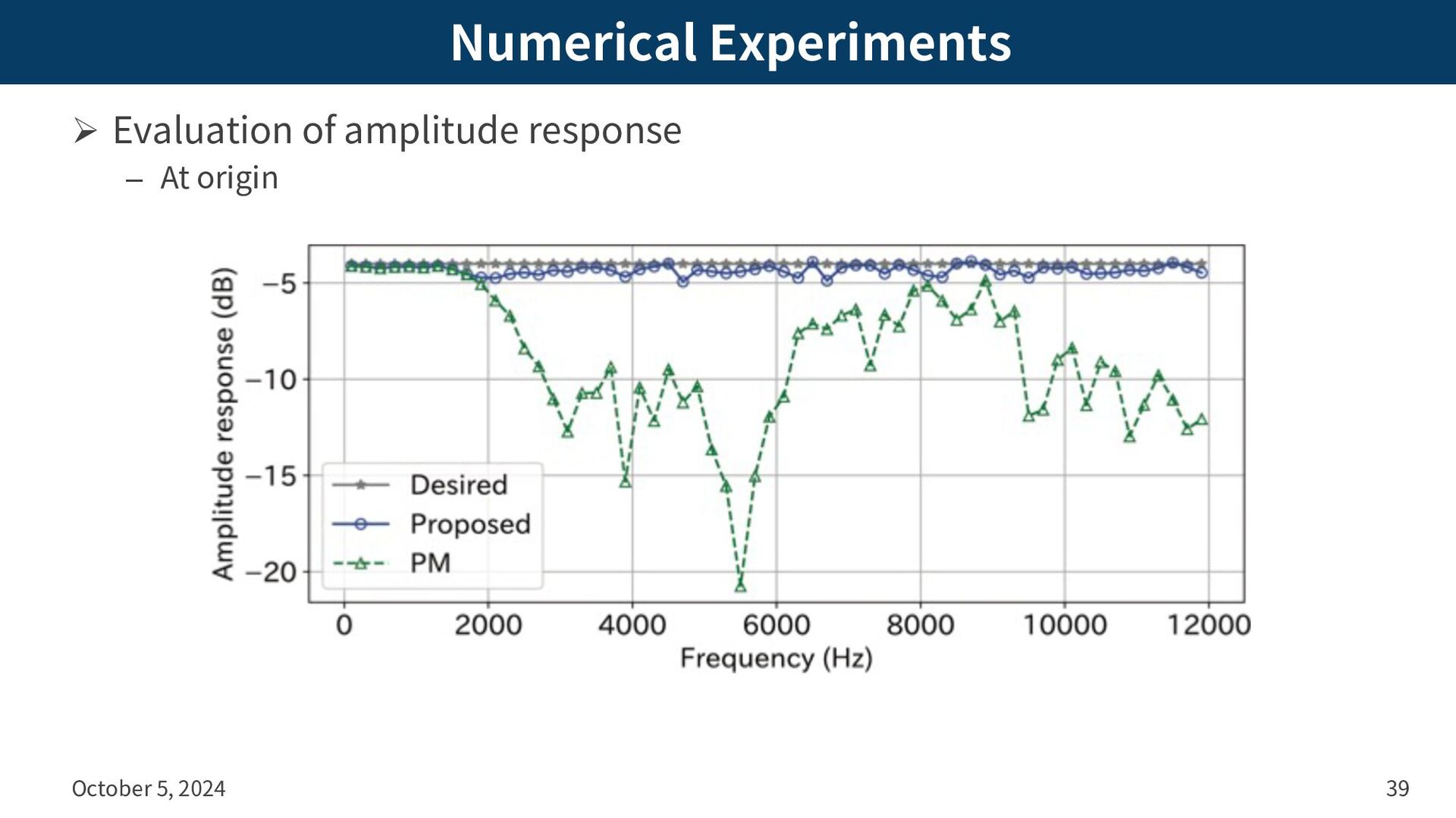 and amplitude matching – is determined so that for low frequencies and for high frequencies – For example, can be defined as sigmoid function October 5, 2024 36 <latexit sha1_base64="7PBZJNy5EyF+eucvkOfjzch+WsM=">AAADWHicfZLtbtMwFIadFthWPtaOn/yxqJA6WKummhiaNKkwJBACMSS6TarbynFOO2uxE9kOoqS+DK6CK4KrwUlTYF9YivLqPc/x8fFxkERcm273p1ep3rp9Z219o3b33v0Hm/XG1rGOU8VgwOIoVqcB1RBxCQPDTQSniQIqgghOgvPDPH7yBZTmsfxs5gmMBJ1JPuWMGmdN6j+I4JIL/g0mGQlEFlrCJRHUnAVBdmjH7y1+11oGtvH+AW75bRKAoduYLHL7TWjb+T+146xIUw4FbS1ZTHrjHn6GC9zRK3yB23hxbcrib07kOghpWSMsN5vUm91Ot1j4qvBL0UTlOpo0vO8kjFkqQBoWUa2Hfjcxo4wqw1kEtkZSDQll53QGQyclFaBHWXGrFj9xToinsXKfNLhw/83IqNB6LgJH5l3oy7HcvC42TM30xSjjMkkNSLYsNE0jbGKcjwiHXAEz0dwJyhR3Z8XsjCrKjBtk7UKZQOwUN6in2rrIa3BtKvjgrI8JKGpi9TQjVM0E/Wpd2zOyk6v/gVyuQKduAt0mxZux2R91I1o+L4euVM0N0r88tqviuNfxn3d2P+02+6/Kka6jR+gxaiEf7aE+eouO0AAxr+HteX3vZeVXFVXXqhtLtOKVOQ/RhVXd+g1mbRVc</latexit> minimize d2CL J(d) := (1 )kGd udesk2 2 + k|Gd| |udes|k2 2 + kdk2 2 <latexit sha1_base64="A4dv1PYDkl/3NJ52frUgh4Qg2ME=">AAACsHicfZFNSyNBEIY7o66a1fVjj14Gg7CIhBkR9SjuHvayqGA0kAmhplMTW7t7hu4aMTvMb9iToD/Nf7M9MRG/Cxoe3nqru6orzqSwFAQPNW9qeubL7Nx8/evC4rel5ZXVM5vmhmOLpzI17RgsSqGxRYIktjODoGKJ5/HVzyp/fo3GilSf0jDDroKBFongQE5qRTES9JYbQTMYhf8WwjE02DiOeyu126if8lyhJi7B2k4YZNQtwJDgEst6lFvMgF/BADsONSi03WLUbelvOKXvJ6lxR5M/Up9XFKCsHarYORXQhX2dq8T3cp2ckv1uIXSWE2r++FCSS59Svxrd7wuDnOTQAXAjXK8+vwADnNwH1V88E6ut6n5jE1u6zC90Yxr846SjDA1QajaLCMxAwU3pxh5EWxV9ZhR6YnT0kdFdIpT4i2XxRB9ahZ5YJ1R3iwxfr+0tnG03w93mzslO4+BwvNI5tsbW2Q8Wsj12wH6zY9ZinAn2j92xe2/ba3s9Dx6tXm1c8529CO/yPyvr2Vk=</latexit> <latexit sha1_base64="v6ZpLa9I3hnLLs2O89d3S1l6XjM=">AAACsnicfZFNaxsxEIblzUdTN9899rLEFEIIZjeYNJdAaHPopTSBOA7xmjArzzrCknaRZkPcZX9ED7m0vyz/JlrHDvkeEDy88440o4kzKSwFwW3Nm5mdm/+w8LH+aXFpeWV1bf3Uprnh2OapTM1ZDBal0NgmQRLPMoOgYomdePijyneu0FiR6hMaZdhTMNAiERzISZ0oRoL98GK1ETSDcfgvIZxAg03i6GKtdhP1U54r1MQlWNsNg4x6BRgSXGJZj3KLGfAhDLDrUINC2yvG/Zb+V6f0/SQ17mjyx+rjigKUtSMVO6cCurTPc5X4Wq6bU7LXK4TOckLN7x9KculT6lfD+31hkJMcOQBuhOvV55dggJP7ovqTZ2K1Xd1vbGJLlzlEN6bBX076naEBSs1WEYEZKLgu3diDaLui94xCT42O3jK6S4QSf7AsHuhNq9BT65TqbpHh87W9hNOdZrjbbB23GgffJytdYF/YBttkIfvGDthPdsTajLMh+8v+sf9eyzv3wOP3Vq82qfnMnoQn7wB2ednb</latexit> = 1 <latexit sha1_base64="nFwv8TaL4YCj47fcATfYtfC3o0Y=">AAACsnicfZFNSyNBEIY74+6qcT/8OHoZNgjLImFGwrqXBVEPXkQFY2QzQWo6NbFJd8/QXbNsHOZHePCiv8x/Y09MxO+Choe33uqu6oozKSwFwW3Nm/nw8dPs3Hx94fOXr98Wl5ZPbJobjm2eytScxmBRCo1tEiTxNDMIKpbYiYc7Vb7zD40VqT6mUYY9BQMtEsGBnNSJYiT4E5wtNoJmMA7/JYQTaLBJHJ4t1a6ifspzhZq4BGu7YZBRrwBDgkss61FuMQM+hAF2HWpQaHvFuN/SX3NK309S444mf6w+rihAWTtSsXMqoHP7PFeJr+W6OSW/e4XQWU6o+f1DSS59Sv1qeL8vDHKSIwfAjXC9+vwcDHByX1R/8kys1qv7jU1s6TK76MY0uO+kgwwNUGp+FhGYgYL/pRt7EK1X9J5R6KnR0VtGd4lQ4gLL4oHetAo9tU6p7hYZPl/bSzjZaIa/mq2jVmNre7LSObbKvrMfLGSbbIvtsUPWZpwN2SW7Zjdey/vrgcfvrV5tUrPCnoQn7wB0Mdna</latexit> = 0 <latexit sha1_base64="A4dv1PYDkl/3NJ52frUgh4Qg2ME=">AAACsHicfZFNSyNBEIY7o66a1fVjj14Gg7CIhBkR9SjuHvayqGA0kAmhplMTW7t7hu4aMTvMb9iToD/Nf7M9MRG/Cxoe3nqru6orzqSwFAQPNW9qeubL7Nx8/evC4rel5ZXVM5vmhmOLpzI17RgsSqGxRYIktjODoGKJ5/HVzyp/fo3GilSf0jDDroKBFongQE5qRTES9JYbQTMYhf8WwjE02DiOeyu126if8lyhJi7B2k4YZNQtwJDgEst6lFvMgF/BADsONSi03WLUbelvOKXvJ6lxR5M/Up9XFKCsHarYORXQhX2dq8T3cp2ckv1uIXSWE2r++FCSS59Svxrd7wuDnOTQAXAjXK8+vwADnNwH1V88E6ut6n5jE1u6zC90Yxr846SjDA1QajaLCMxAwU3pxh5EWxV9ZhR6YnT0kdFdIpT4i2XxRB9ahZ5YJ1R3iwxfr+0tnG03w93mzslO4+BwvNI5tsbW2Q8Wsj12wH6zY9ZinAn2j92xe2/ba3s9Dx6tXm1c8529CO/yPyvr2Vk=</latexit> <latexit sha1_base64="ROtRu2ks9BH5ktUl1T0BgfcB3qQ=">AAADB3icfVHNbhMxEHaWv7L8peXIxSJCaqGNdqsKekGqgAMXRJGatiIOkdeZ3Vpd2yvbiwiWH4AH4Dm4IY7wGLwAV3gEvMkG0ZYykuVP33zjGX+TVSU3Nkm+d6ILFy9dvrJ0Nb52/cbNW93llX2jas1gwFSp9GFGDZRcwsByW8JhpYGKrISD7Phpkz94C9pwJffstIKRoIXkOWfUBmrcfU0ysHSVKAEFXcOPcUxyTZlLvUsfEEHtkRYO/Bu3MeeJ4YWg3m2Sivu2bGN+jd1Cv+f9mvfjbi/pJ7PAZ0Hagh5qY3e83PlIJorVAqRlJTVmmCaVHTmqLWcl+JjUBirKjmkBwwAlFWBGbmaCx/cCM8G50uFIi2fs3xWOCmOmIgvKZkxzOteQ/8oNa5tvjxyXVW1BsnmjvC6xVbhxFE+4BmbLaQCUaR5mxeyIBrNs8D0+0SYT6zOLTG58yDyD8E0NLwL1sgJNrdL3HaE6OPzOh28XZL1B/xNyuRAGdJ4wPMIFfw/e/UHnSrlcSBcoDotMT6/tLNjf7KcP+1uvtno7T9qVLqE76C5aRSl6hHbQc7SLBoihr+gH+ol+RR+iT9Hn6MtcGnXamtvoRETffgMYmvzf</latexit> (!) = 1 1 + e 2⇡ (! !T) Transition frequency Can still be solved by MM algorithm or ADMM Pressure matching Amplitude matching [Kimura+ IEEE WASPAA 2023]