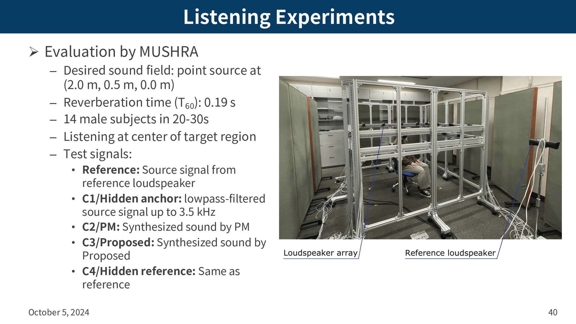 point source at (2.0 m, 0.5 m, 0.0 m) – Reverberation time (T60 ): 0.19 s – 14 male subjects in 20-30s – Listening at center of target region – Test signals: • Reference: Source signal from reference loudspeaker • C1/Hidden anchor: lowpass-filtered source signal up to 3.5 kHz • C2/PM: Synthesized sound by PM • C3/Proposed: Synthesized sound by Proposed • C4/Hidden reference: Same as reference October 5, 2024 40