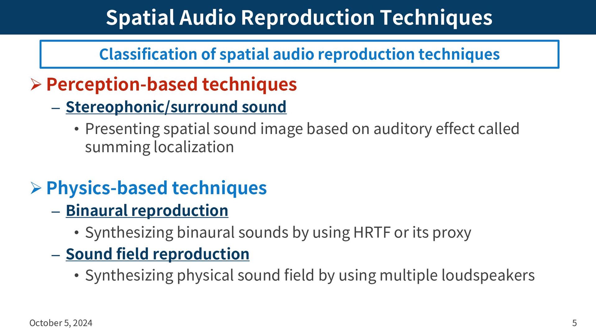 • Presenting spatial sound image based on auditory effect called summing localization Ø Physics-based techniques – Binaural reproduction • Synthesizing binaural sounds by using HRTF or its proxy – Sound field reproduction • Synthesizing physical sound field by using multiple loudspeakers October 5, 2024 5 Classification of spatial audio reproduction techniques