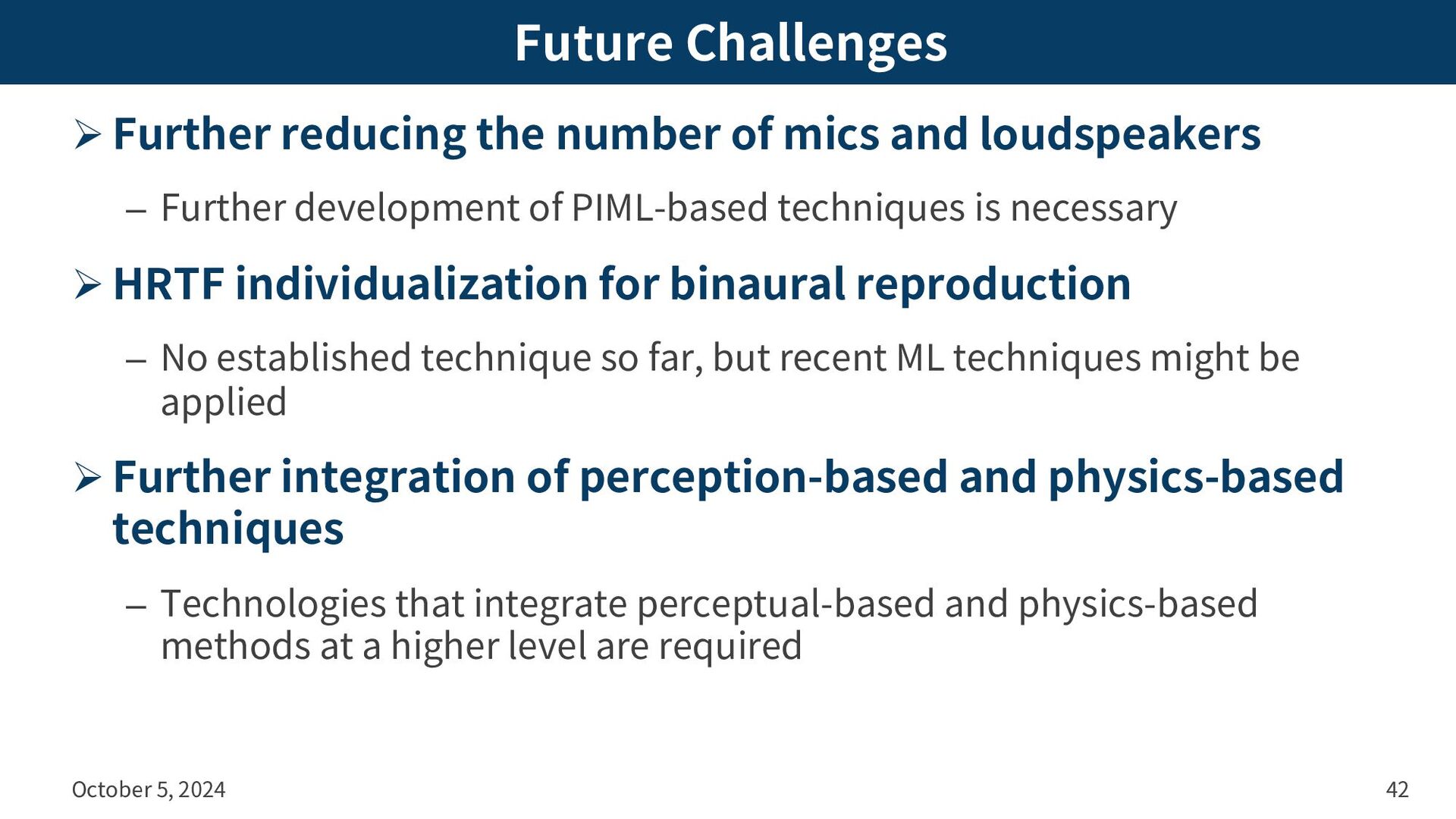 Further development of PIML-based techniques is necessary Ø HRTF individualization for binaural reproduction – No established technique so far, but recent ML techniques might be applied Ø Further integration of perception-based and physics-based techniques – Technologies that integrate perceptual-based and physics-based methods at a higher level are required Future Challenges October 5, 2024 42