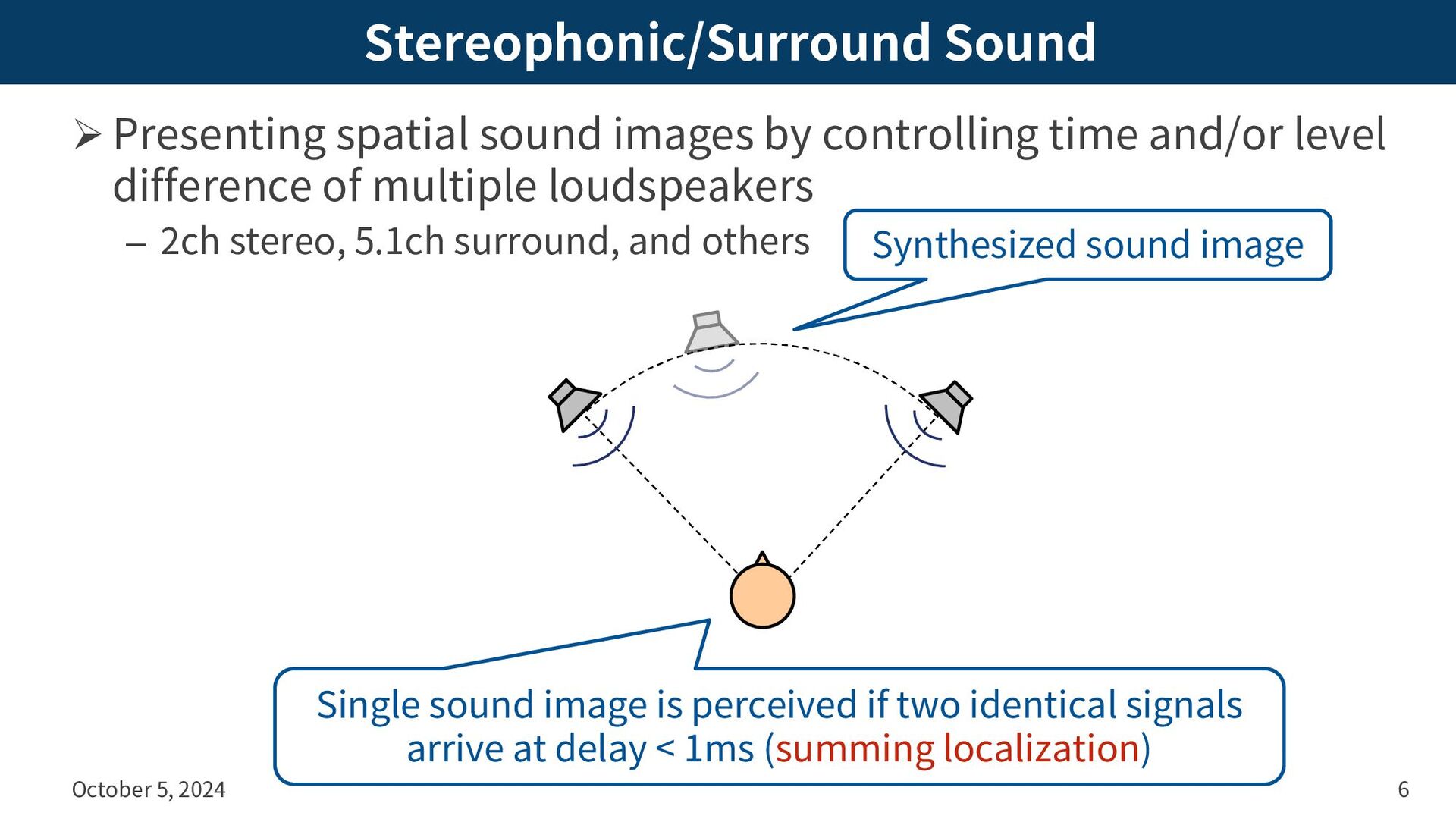 and/or level difference of multiple loudspeakers – 2ch stereo, 5.1ch surround, and others October 5, 2024 6 Synthesized sound image Single sound image is perceived if two identical signals arrive at delay < 1ms (summing localization)