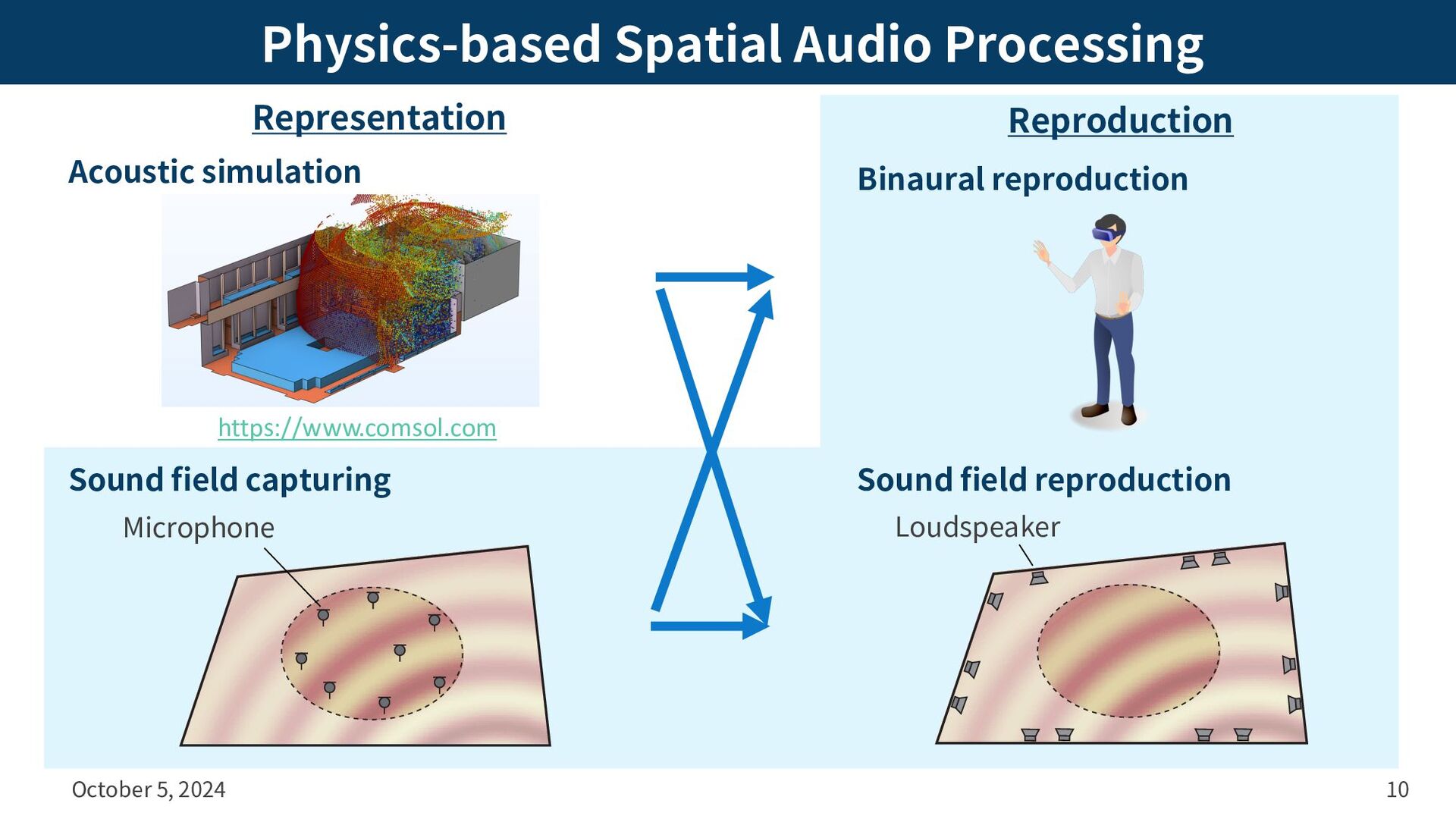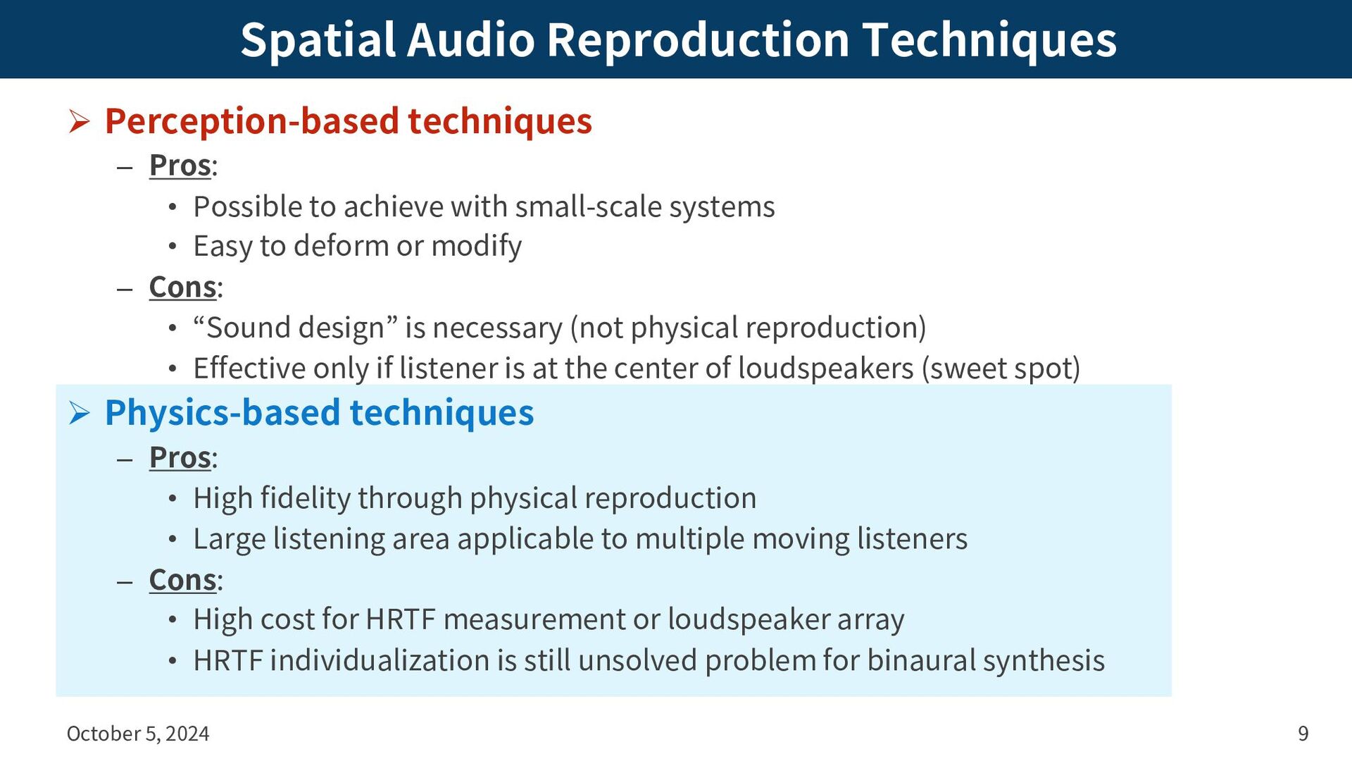 Possible to achieve with small-scale systems • Easy to deform or modify – Cons: • “Sound design” is necessary (not physical reproduction) • Effective only if listener is at the center of loudspeakers (sweet spot) Ø Physics-based techniques – Pros: • High fidelity through physical reproduction • Large listening area applicable to multiple moving listeners – Cons: • High cost for HRTF measurement or loudspeaker array • HRTF individualization is still unsolved problem for binaural synthesis October 5, 2024 9