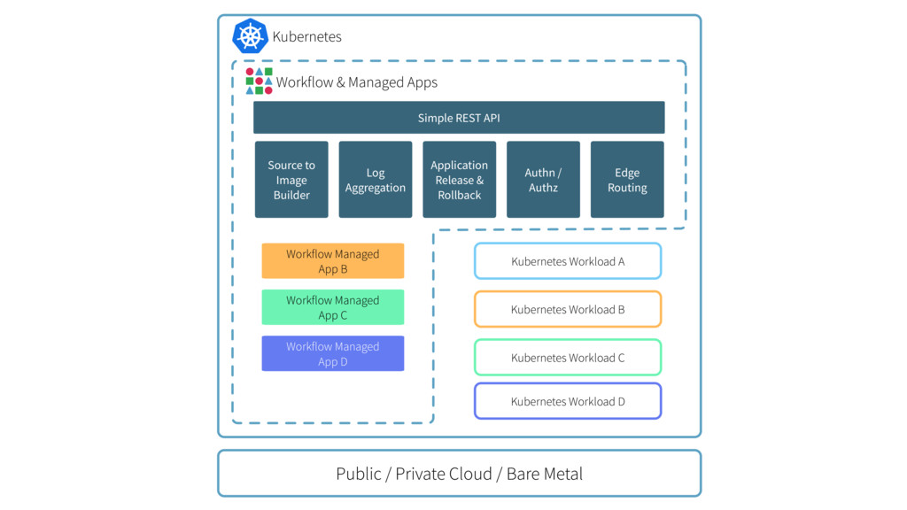 C Workflow Managed App D Workflow Managed App B Kubernetes Workload A Kubernetes Workload B Kubernetes Workload C Kubernetes Workload D Workflow & Managed Apps Simple REST API Source to Image Builder Log Aggregation Application Release & Rollback Authn / Authz Edge Routing Kubernetes