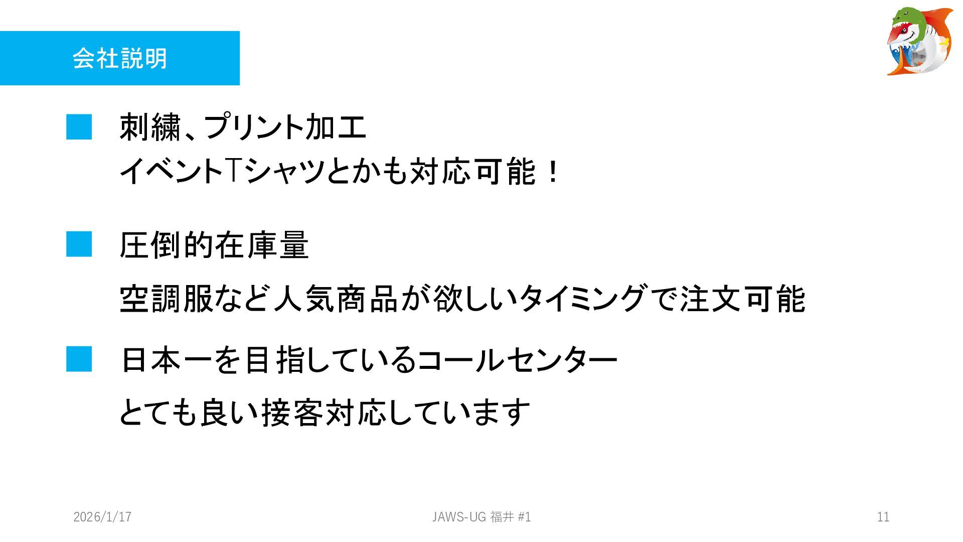 2026/1/17 JAWS-UG 福井 #1 11 会社説明 刺繍、プリント加工 圧倒的在庫量 日本一を目指しているコールセンター イベントTシャツとかも対応可能!