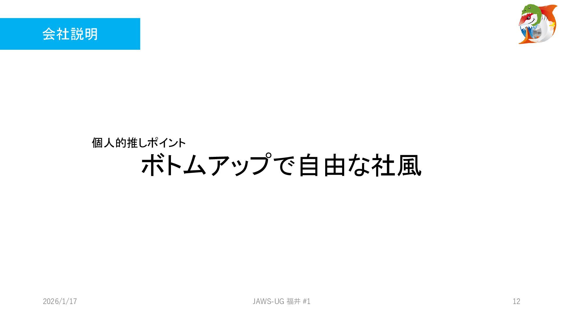 2026/1/17 JAWS-UG 福井 #1 12 会社説明 個人的推しポイント ボトムアップで自由な社風