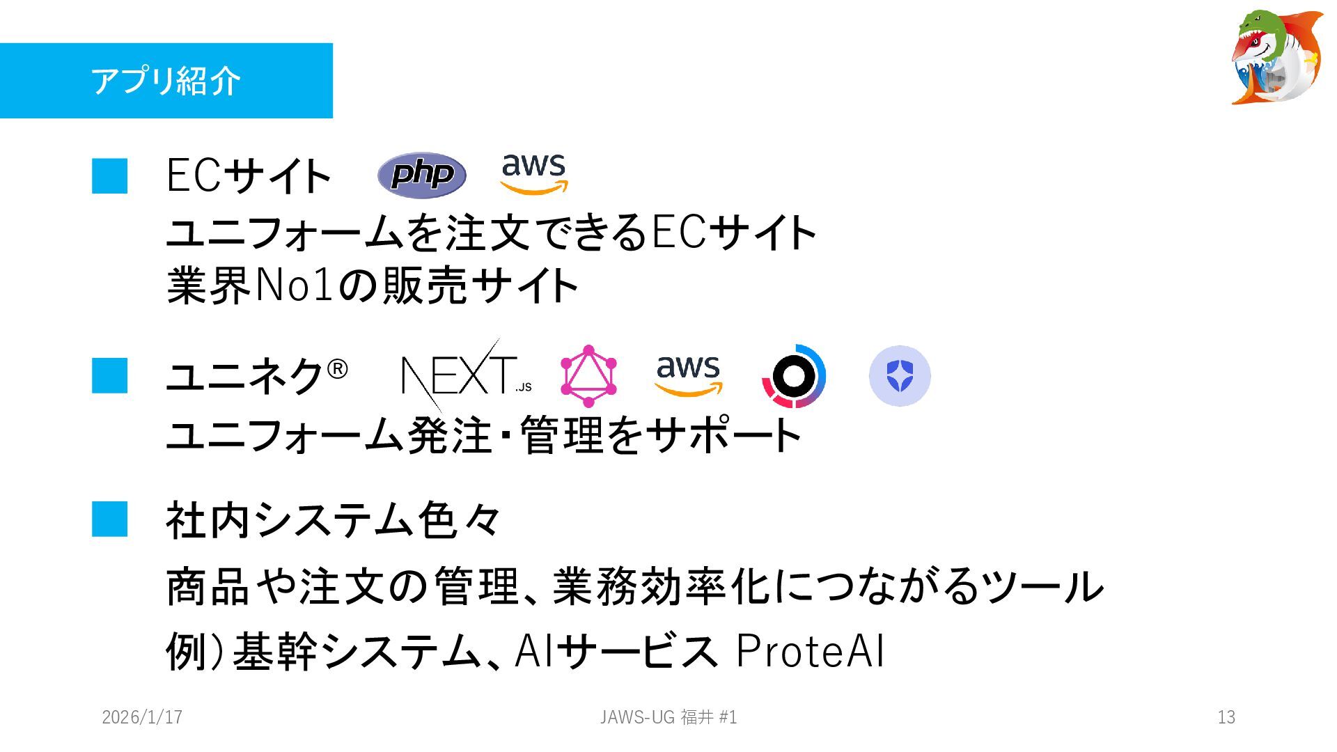 2026/1/17 JAWS-UG 福井 #1 13 アプリ紹介 ECサイト ユニネク®︎ 社内システム色々 ユニフォームを注文できるECサイト