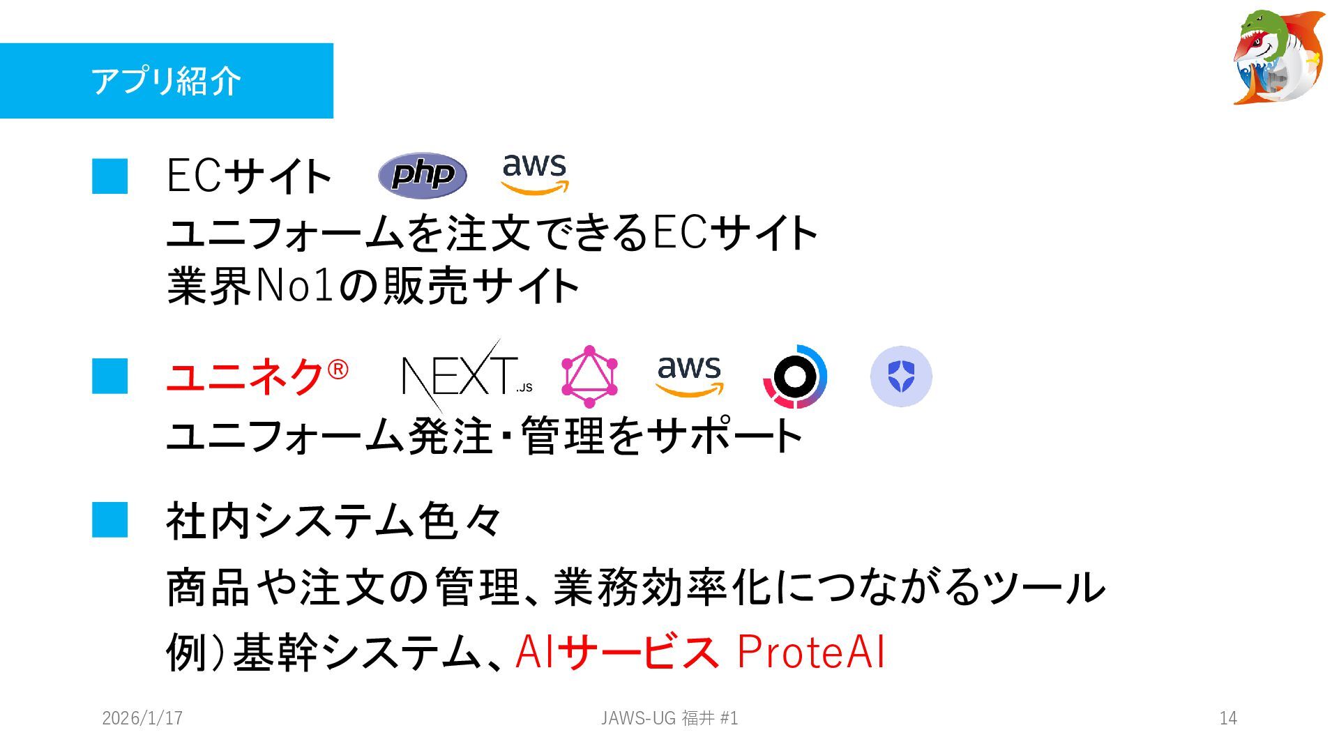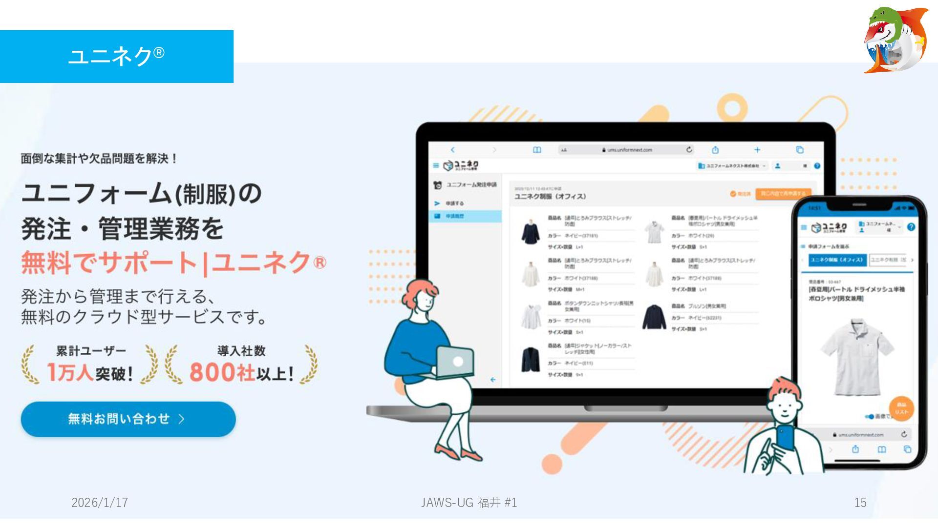 2026/1/17 JAWS-UG 福井 #1 14 アプリ紹介 ECサイト ユニネク®︎ 社内システム色々 ユニフォームを注文できるECサイト