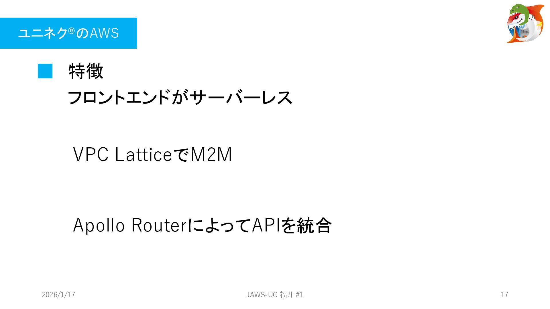2026/1/17 JAWS-UG 福井 #1 17 ユニネク®︎のAWS 特徴 フロントエンドがサーバーレス VPC LatticeでM2M